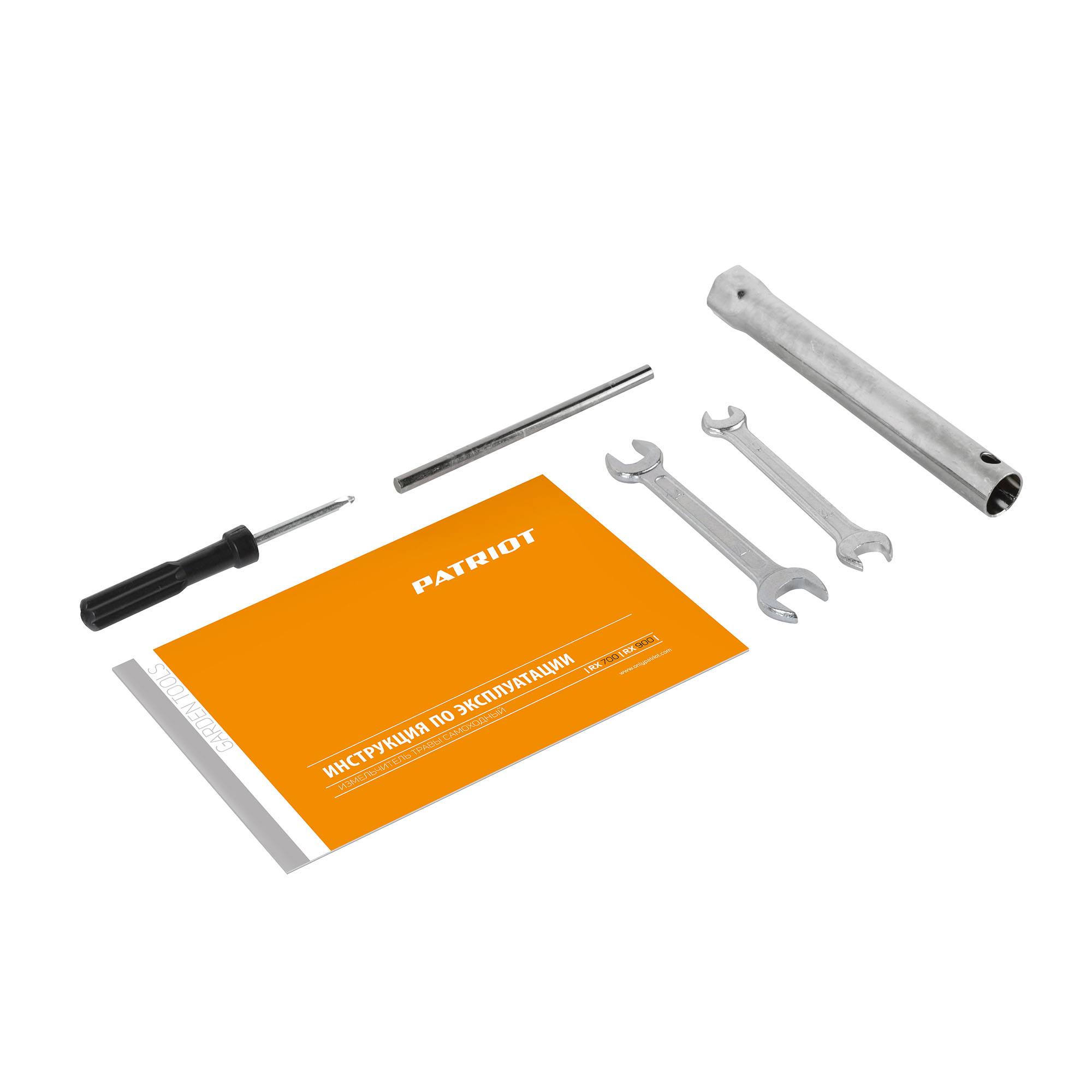 Бурьянокосилка бензиновая; Колесо безвоздушное в сборе со ступицей: 2 шт; Защитный кожух ремней; Комплект метизов для сборки; Рычаг КПП; Комплект ключей для сборки; Передний бампер-ограничитель; Инструкция по эксплуатации;
