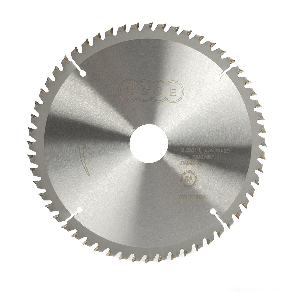 Наружный диаметр 200мм, кол-во зубьев 56, посадочное отверстие 32мм, 30мм, 20мм пильный диск для циркулярной пилы с твердосплавными напайками, специально заточенными для чистовой распиловки ламината, без сколов.