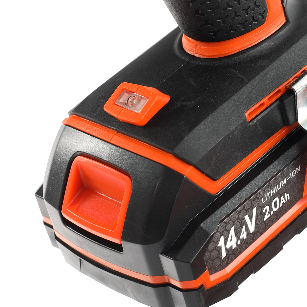 14.4 В, 2.0 Ач, Li-ion, 2 скорости 350-1350 об/мин, крутящий момент 27 Нм, 2 АКБ и ЗУ в комплекте, кейс