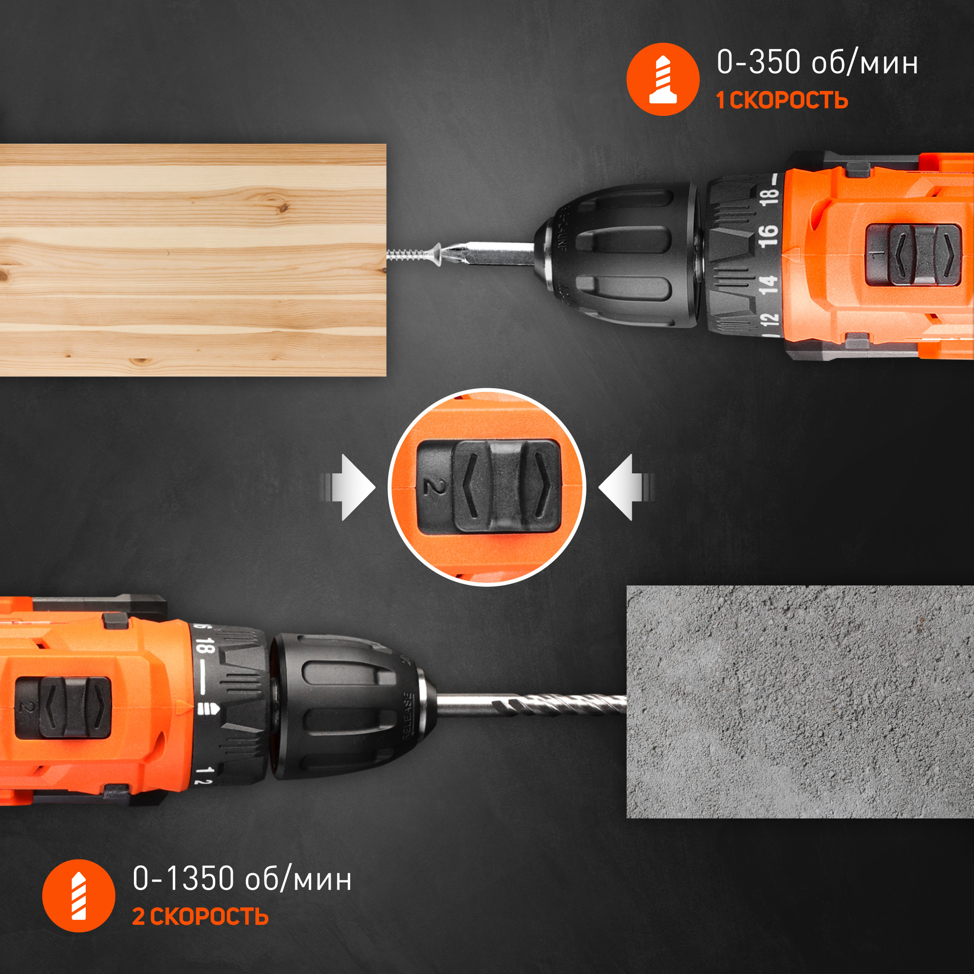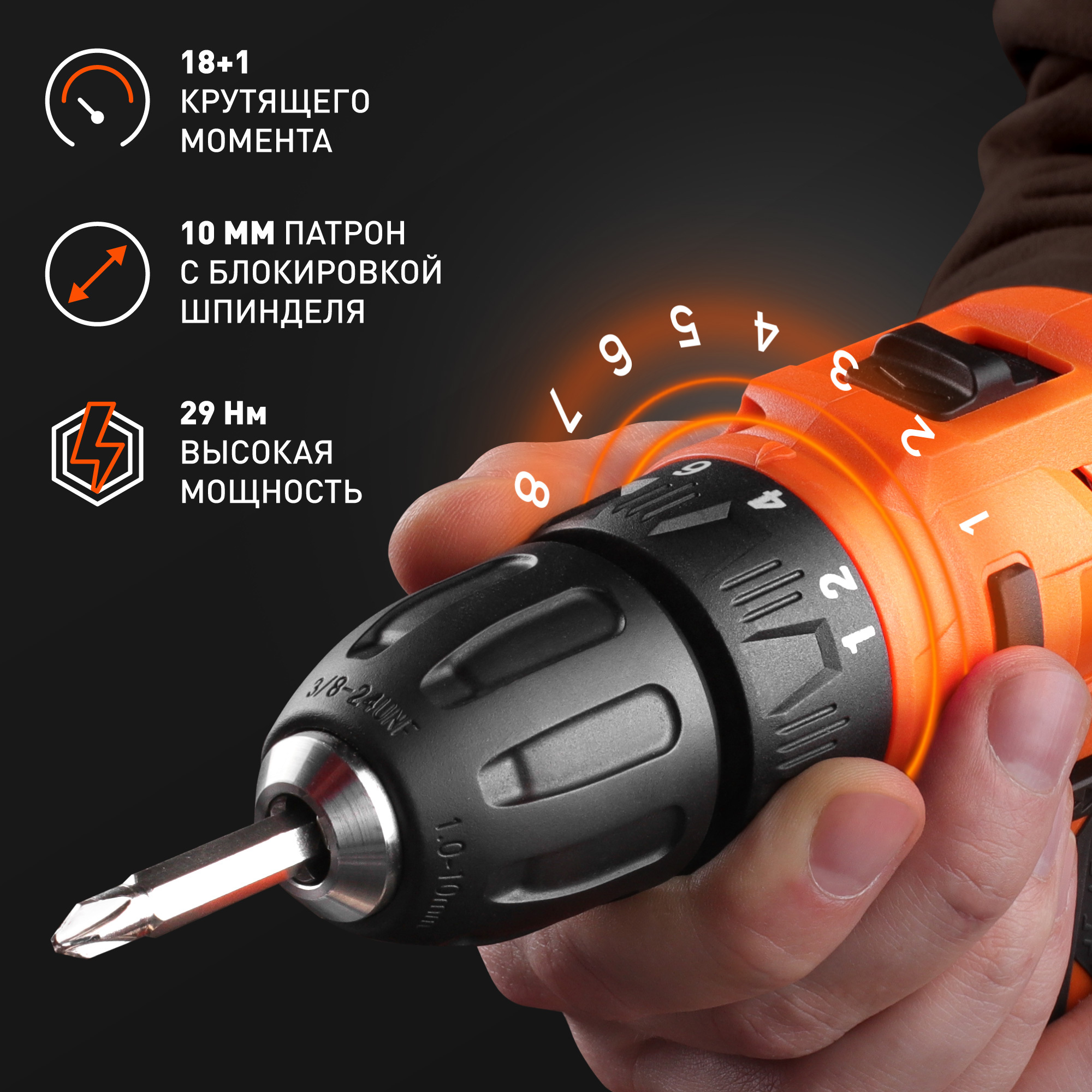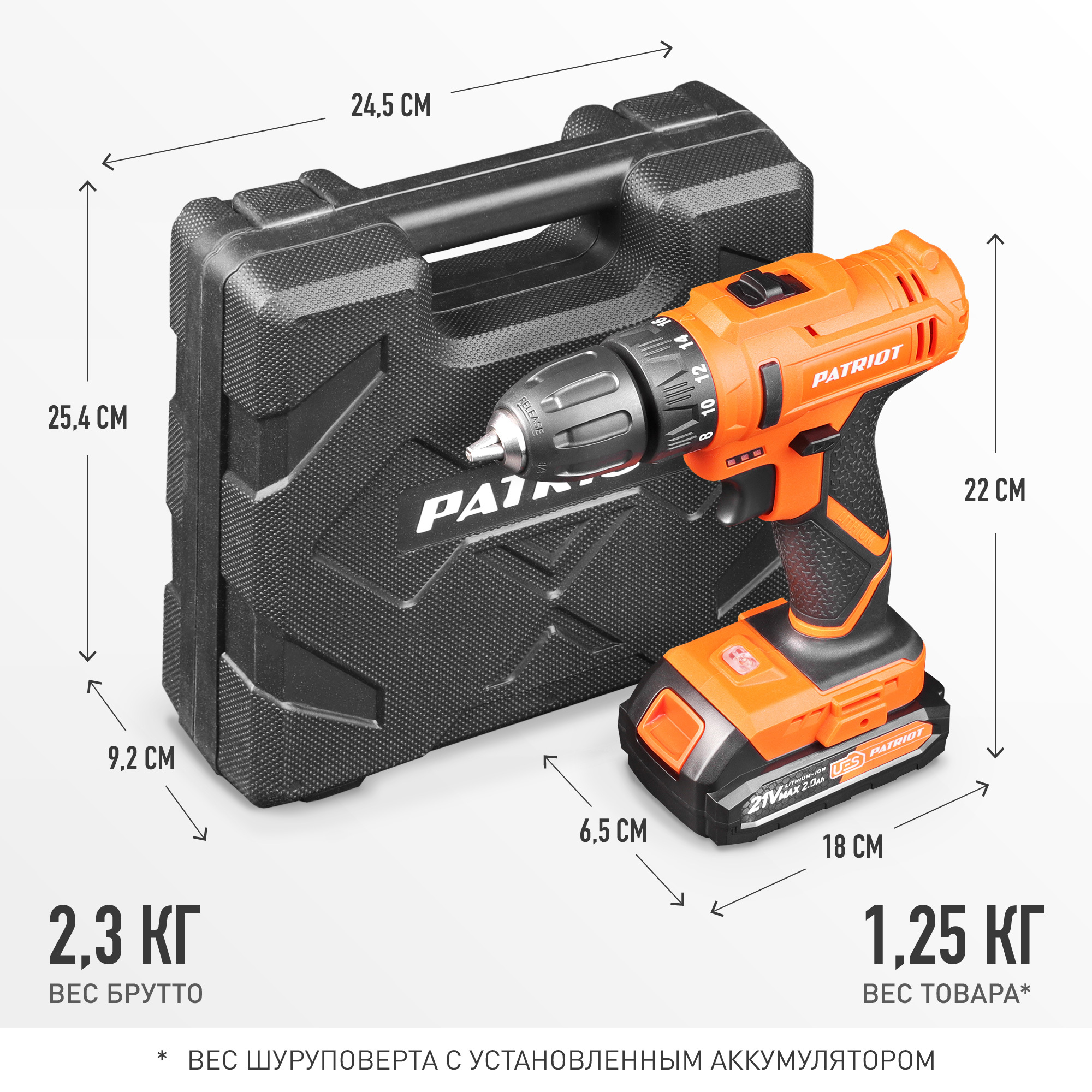 Дрель-шуруповерт аккумуляторная; Аккумуляторная батарея: 2 шт.; Зарядное устройство; Пластиковый кейс; Инструкция по эксплуатации;