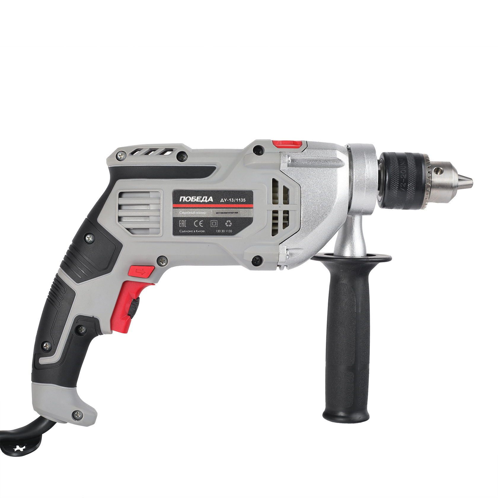 Дрель ударная ДУ-13/1135 снабжена ключевым патроном, что способствует надежному креплению оснастки. С помощью специального колёсика на курке выключателя, можно регулировать число оборотов. Предусмотрена функция реверса, которая помогает извлечь сверло при заклинивании. Металлический корпус редуктор увеличивает интенсивность теплоотвода и надежно защищает механизм от внешних ударов.