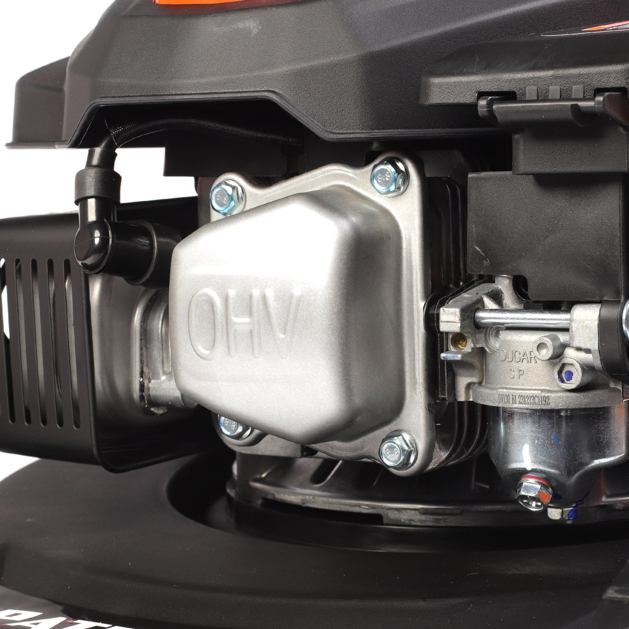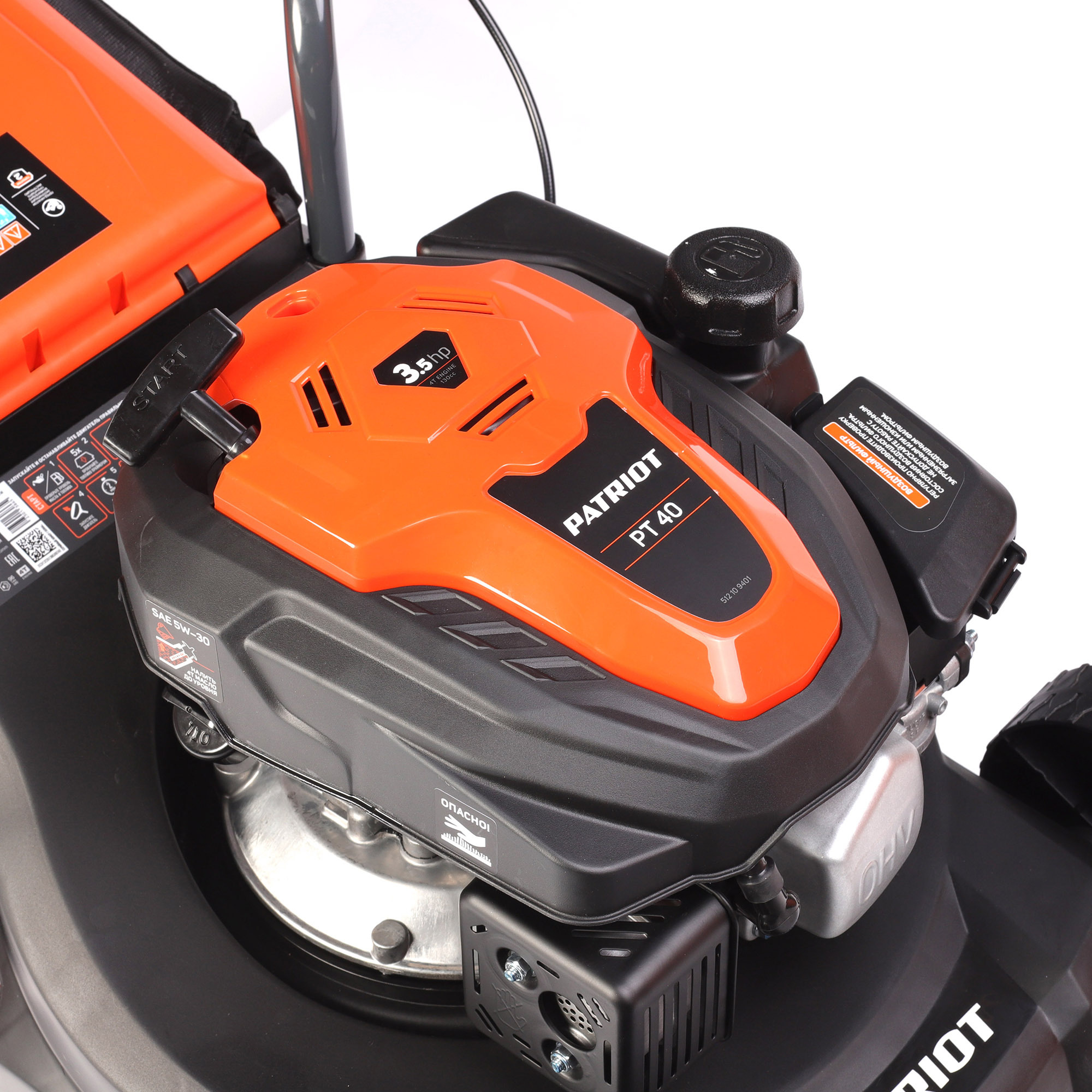 3.5 л.с, 130 см.куб, ширина скашивания 40 см, 30-65 мм высота скашивания, травосборник 35 л, топливный бак 0.8 л, 4-х тактный двигатель, задний выброс травы, складная рукоятка, пластиковая дека