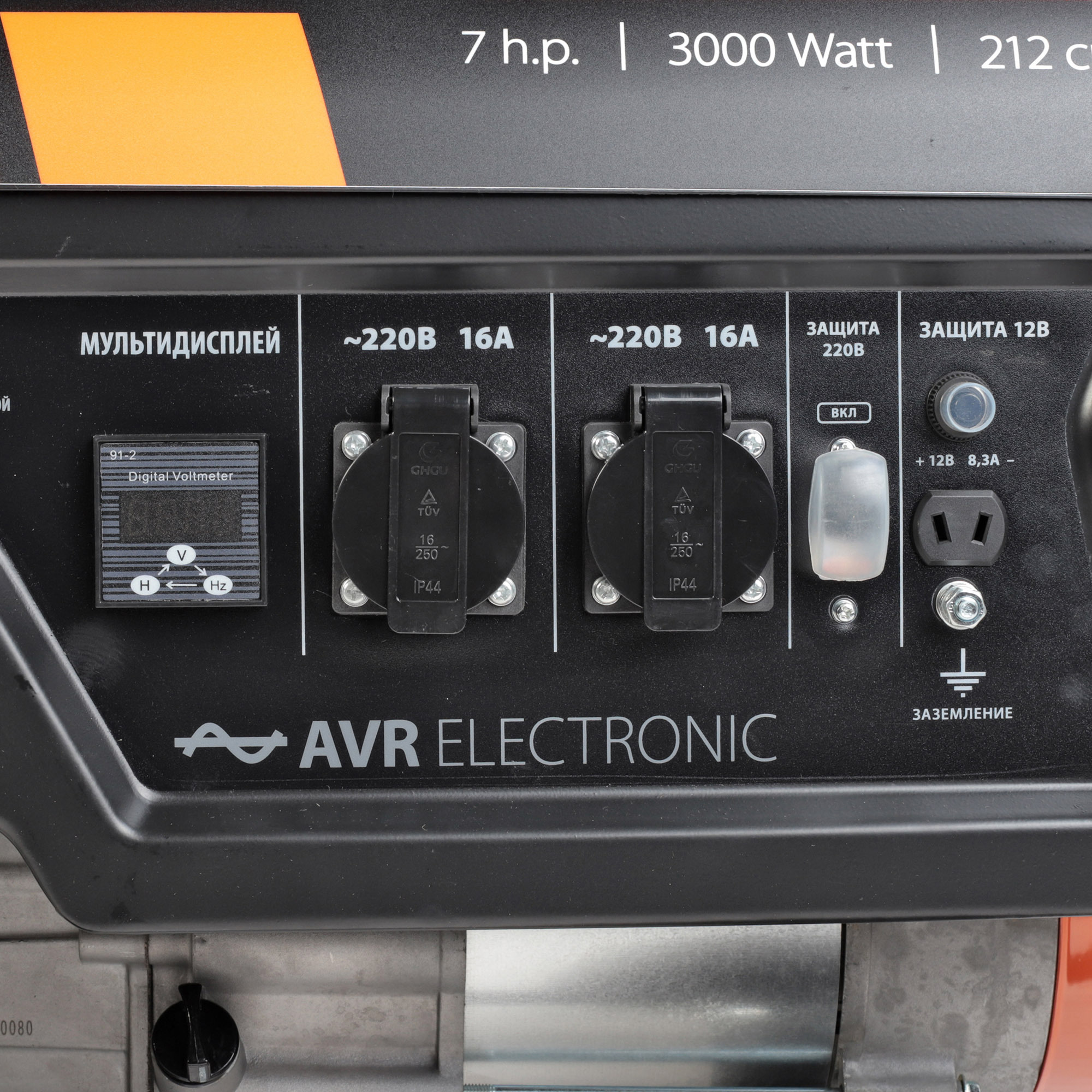 мощность 3-2.8 кВт, 212 см.куб, 7 л.с, топливный бак 15 л, 4-х тактный двигатель, розетки 2х230 В, 16 А, 1х12 В, AVR, открытый корпус, вольтметр, синхронный альтернатор