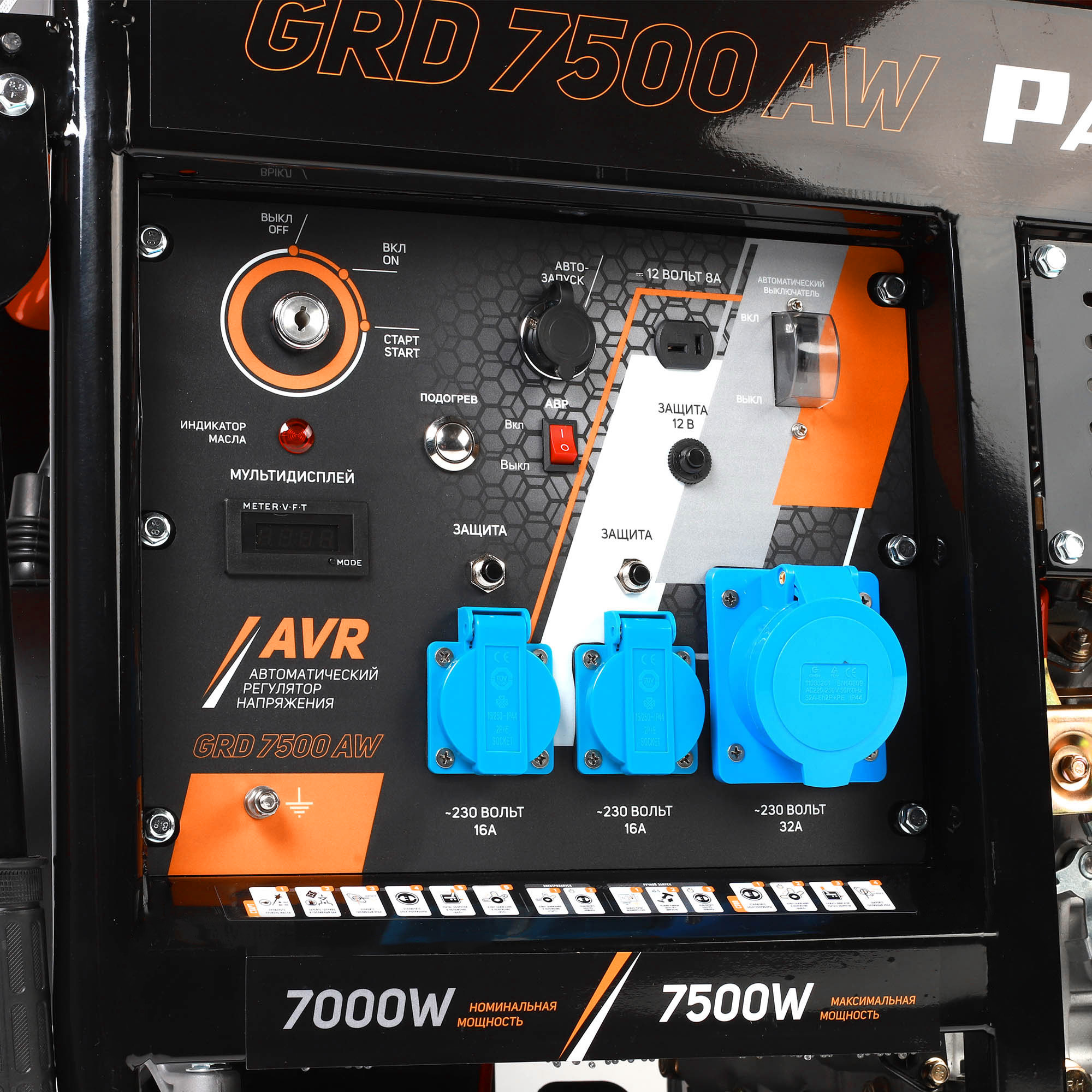 мощность 7.5-7 кВт, 532 см.куб, 11.5 л.с, топливный бак 15 л, 4-х тактный двигатель, дизель, розетки 3х230 В, 1х12 В, электро+автозапуск АКБ, дисплей, колеса