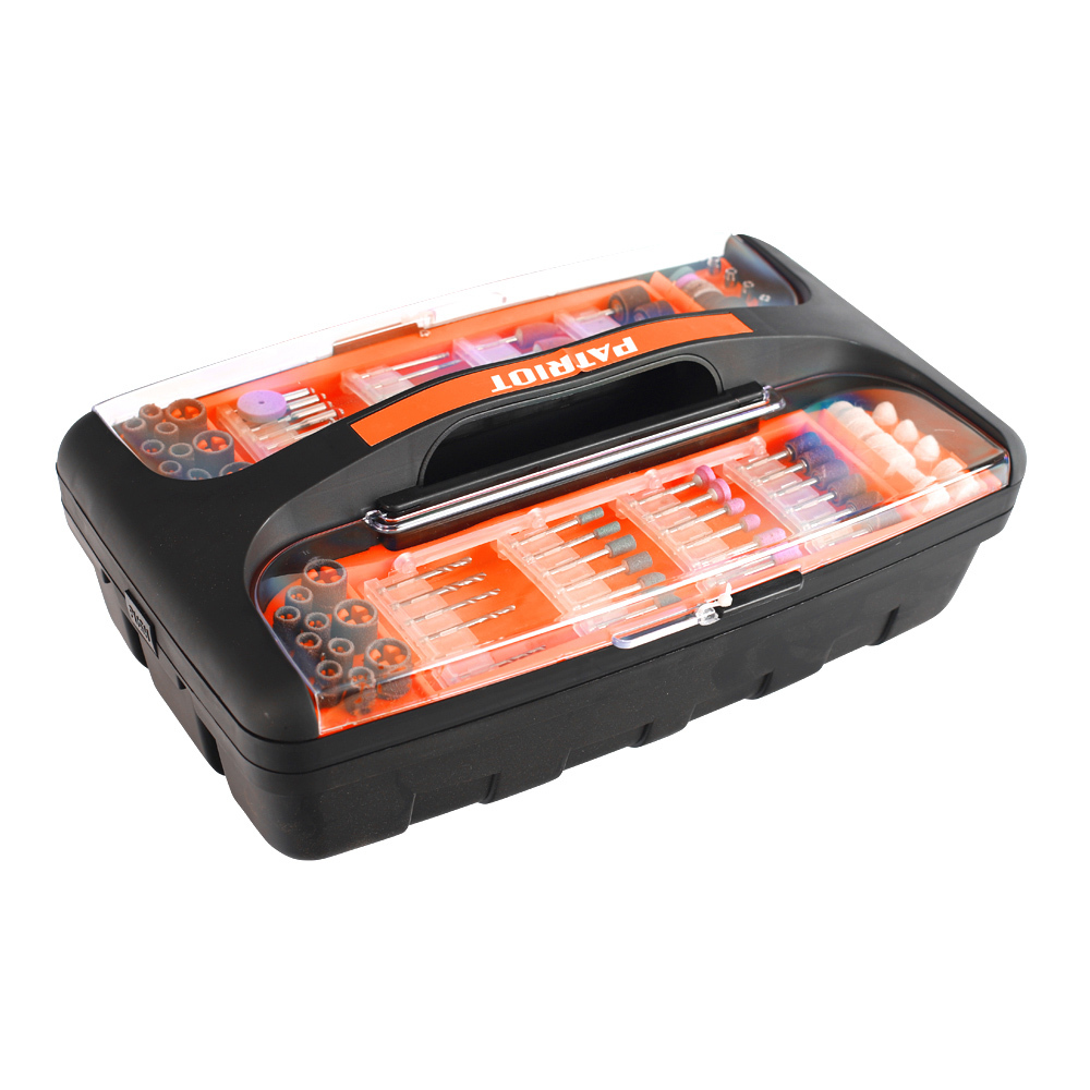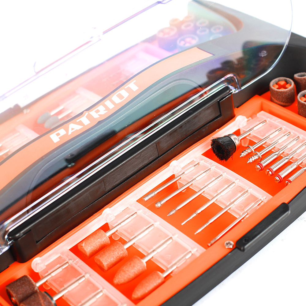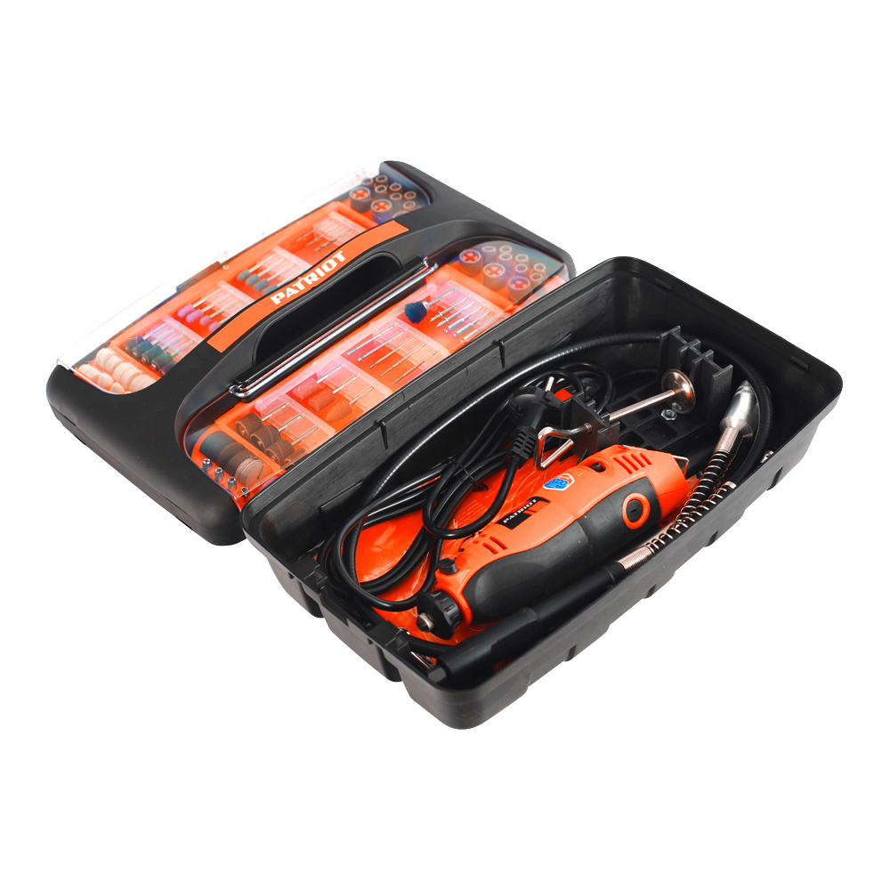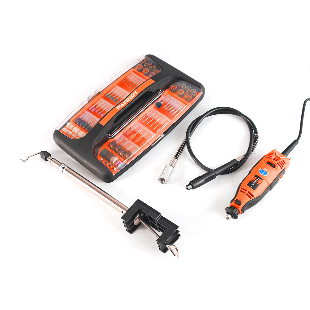 Гравер; Гибкий вал; Подставка (штатив, струбцина); Цанга (1,6 мм); Цанга(2,4 мм); Цанга (3,2 мм): 2 шт.; Полировальный круг (20х3 мм): 2 шт.; Полировальная бумага (диаметр 20 мм, зернистость 240): 30 шт.; Коричневый отрезной диск (0,7х19 мм): 20 шт.; Черный отрезной диск (0,7х19 мм): 20 шт.; Малое шлифовальное кольцо (6,35х12,7 мм): 20 шт.; Большое шлифовальное кольцо (12,7х12,7 мм): 10 шт.; Малая шлифовальная лента (6,35х12,7 мм): 6 шт.; Большая шлифовальная лента (12,7х12,7 мм): 4 шт.; Точильный камень (3,2 мм): 4 шт.; Малый точильный камень (3,2 мм): 6 шт.; Держатель (диаметр 3,2 мм): 2 шт.; Держатель для кругов (3,2 мм): 4 шт.; Щетка чашеобразная (3,2 мм); Насадка войлочная «пуля» (9х19 мм): 3 шт.; Войлочный полировальный круг (6,35х12,7 мм): 4 шт.; Войлочный полировальный круг (6,35х18 мм): 5 шт.; Алмазная шарошка (3,4 мм): 6 шт.; Точильный камень (3,4 мм): 6 шт.; Сверло по металлу (1.6x2,2.4x2,3.2x2 мм): 6 шт.; Кейс; Инструкция по эксплуатации;