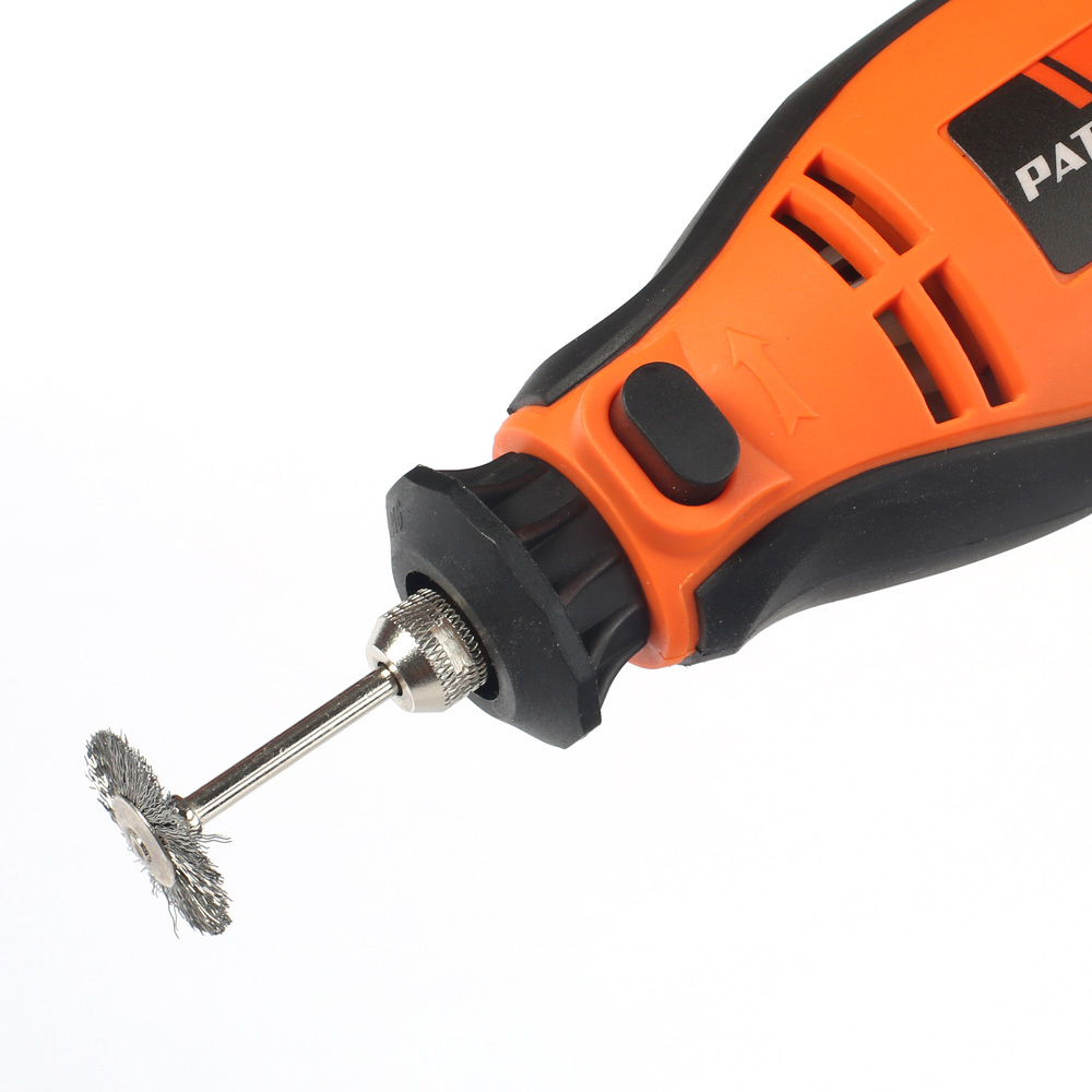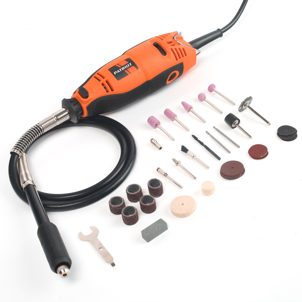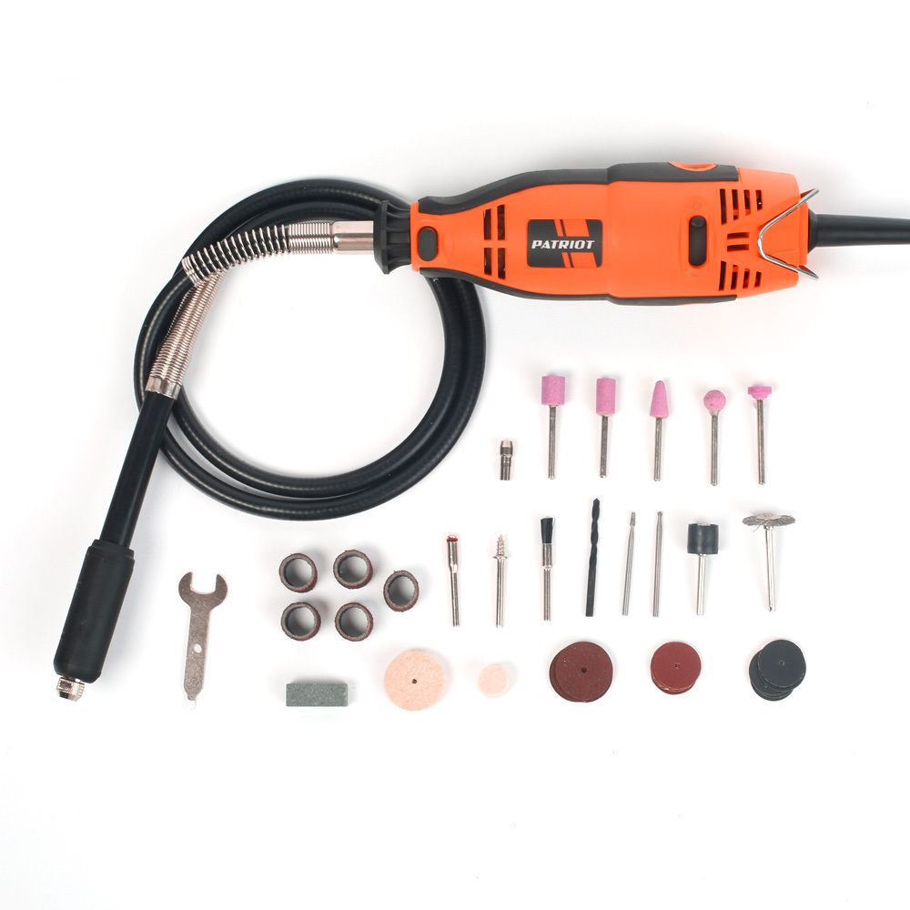 Гравер; Гибкий вал; Подставка; Шлифовальная лента (12,7х12,7мм, зернистость 80); Шлифовальная лента (12,7х12,7мм, зернистость 100): 2 шт.; Шлифовальная лента (12,7х12,7мм, зернистость 120): 2 шт.; Точильный камень цилиндрический; Точильный камень цилиндрический усеченный; Точильный камень сферический; Точильный камень канонический узкий; Точильный камень канонический широкий; Шлифовальная бумага, (диаметр 20 мм, зернистость 100): 5 шт.; Шлифовальная бумага, (диаметр 20 мм, зернистость 120): 2 шт.; Шлифовальная бумага (диаметр 20 мм, зернистость 240): 3 шт.; Отрезной диск (диаметр 24 мм, зернистость 150): 4 шт.; Отрезной диск (диаметр 24 мм, зернистость 180): 4 шт.; Щетка проволочная; Насадка для шлифовальной ленты; Полировальный круг: 2 шт.; Щетинная щетка; Сверло по металлу 3,2 мм HSS; Державка для отрезных и полировальных кругов; Фрезерная шарошка (2,4 мм): 2 шт.; Цанга 2,4 мм; Держатель 3,2 мм; Инструкция по эксплуатации;