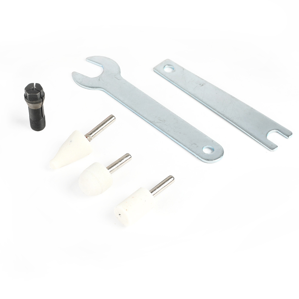 Машина прямошлифовальная; Шлифовальные головки: 3 шт.; Ключ: 2 шт.; Запасные щетки; Инструкция по эксплуатации;
