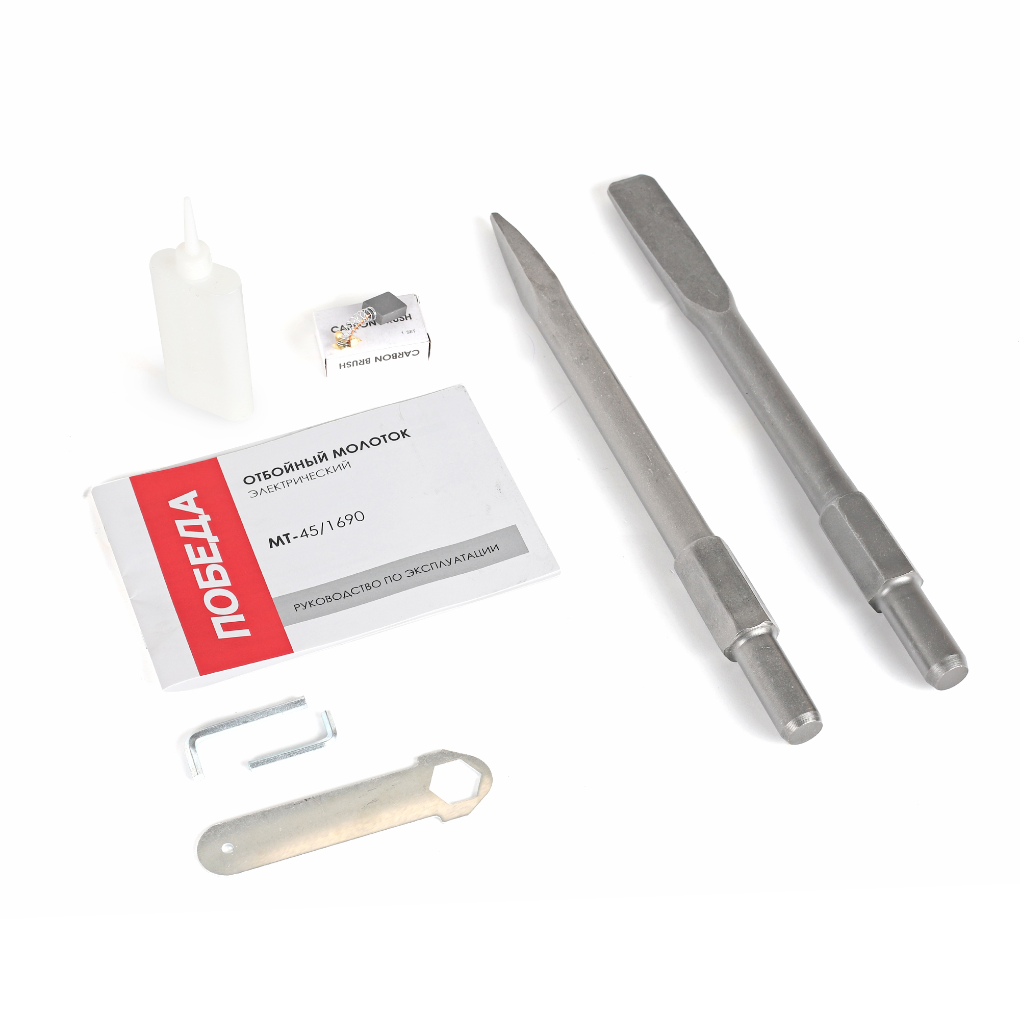 Молоток отбойный: 1 шт.; Дополнительная рукоятка: 1 шт.; Зубило пикообразное: 1 шт.; Зубило плоское: 1 шт.; Резервуар для масла: 1 шт.; Ключ: 1 шт.; Металлический кейс: 1 шт.; Инструкция по эксплуатации