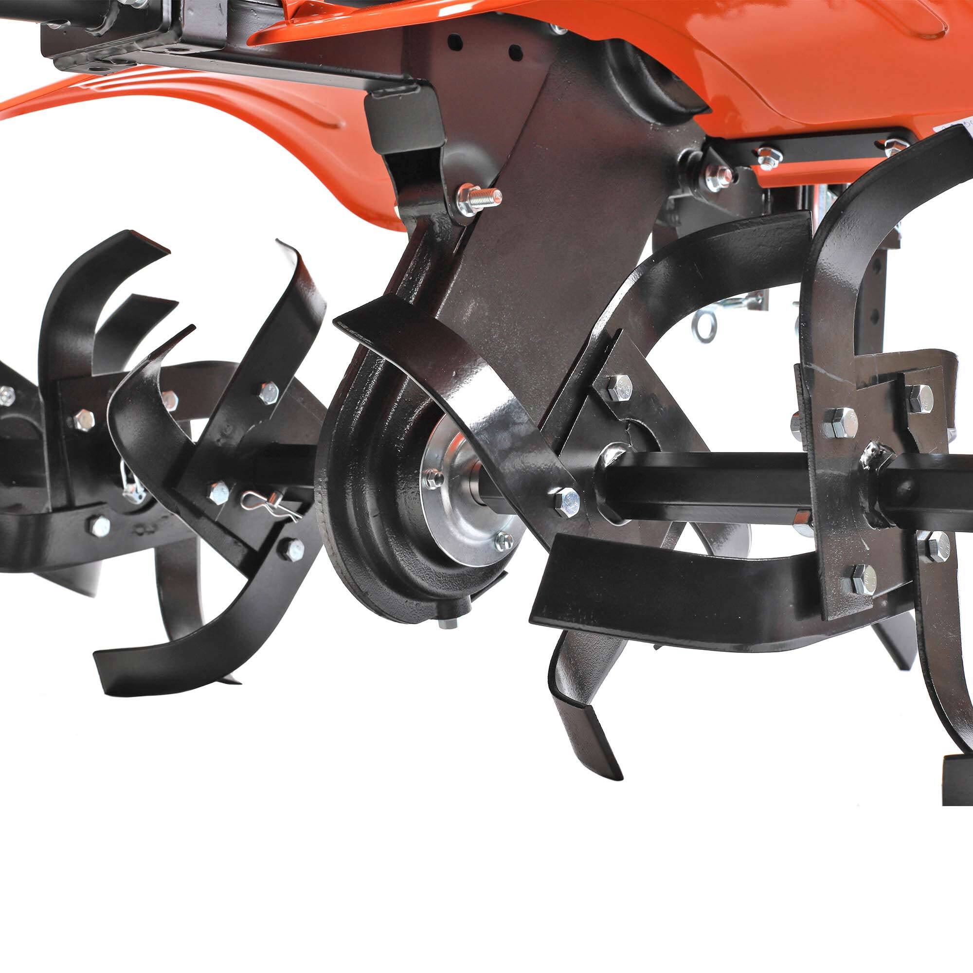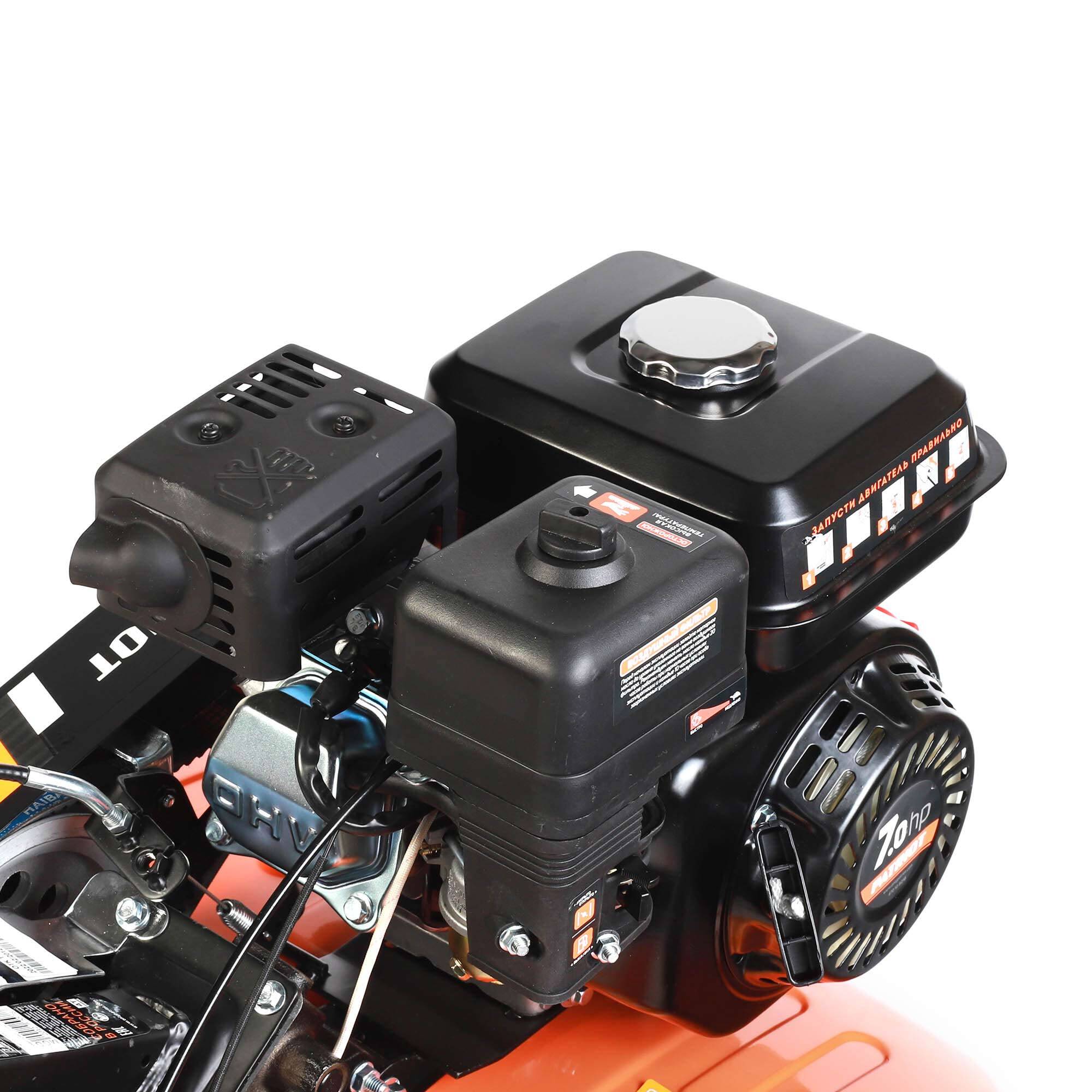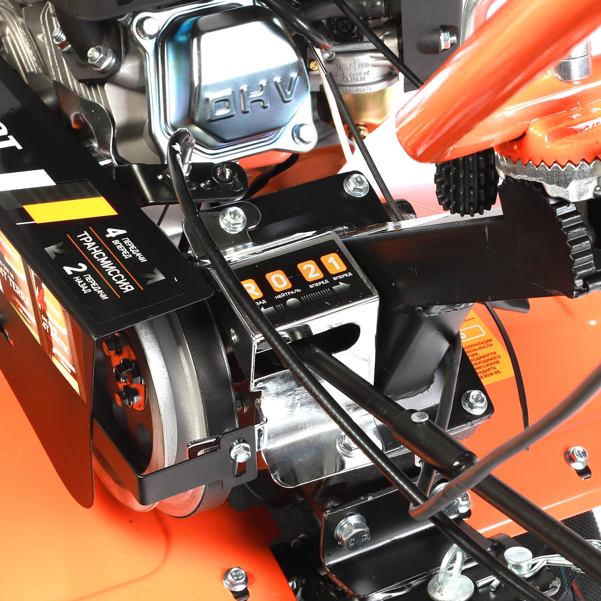 7 л.с, 212 см.куб, топливный бак 3.6 л, 0.6 л картер, ширина обработки 85 см, глубина 16-30 см, фрезы 32 см, чугунный редуктор, 4 вперед/2 назад, 4-х тактный двигатель, шкив