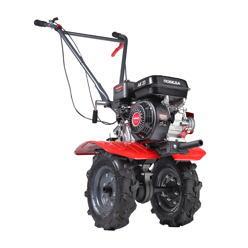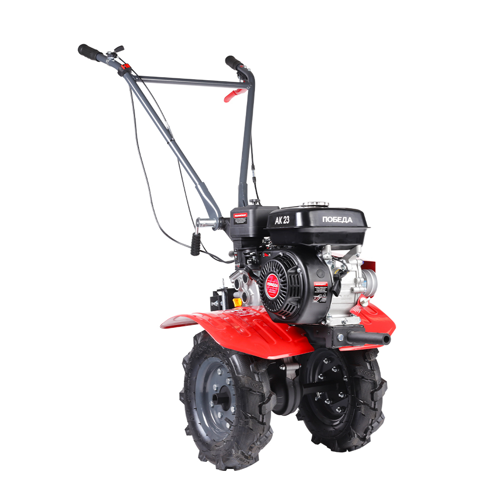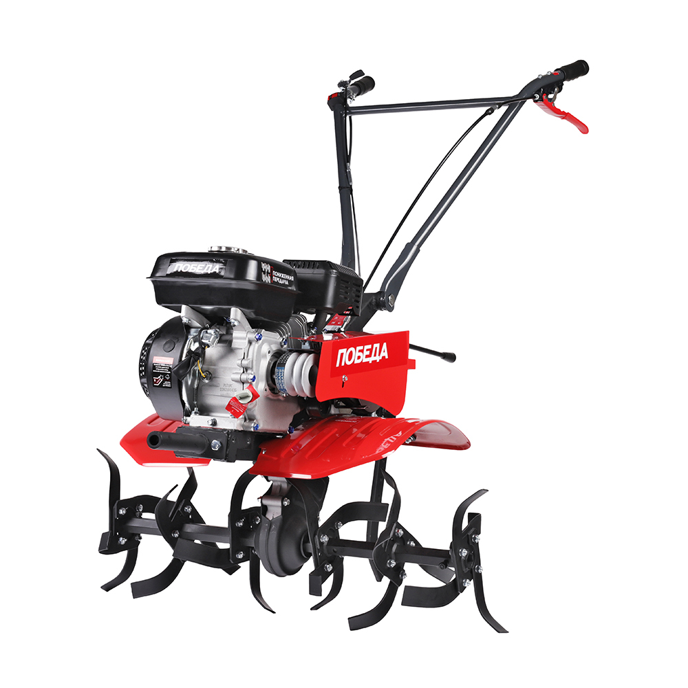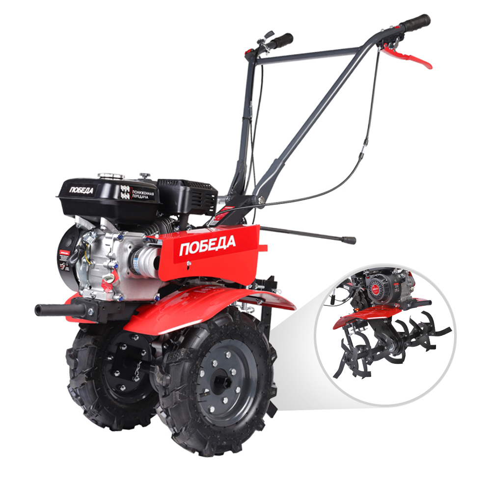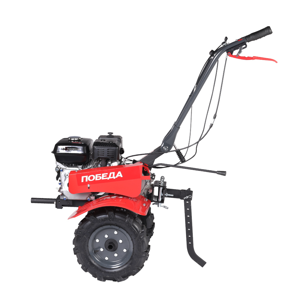 Универсальный мотоблок Победа предназначен для выполнения различных работ по рыхления и культивации почвы на приусадебных участках. Мотоблок оснащен мощным 4-х тактным бензиновым двигателем и надежной многоступенчатой трансмиссией - шестеренчато-цепным редуктором в алюминиевом корпусе. Установка различного навесного оборудования значительно расширяет применение мотоблока от уборки снега и листвы, обработки почвы до перевозки грузов. Большие пневматические колеса гарантируют отличную проходимость.