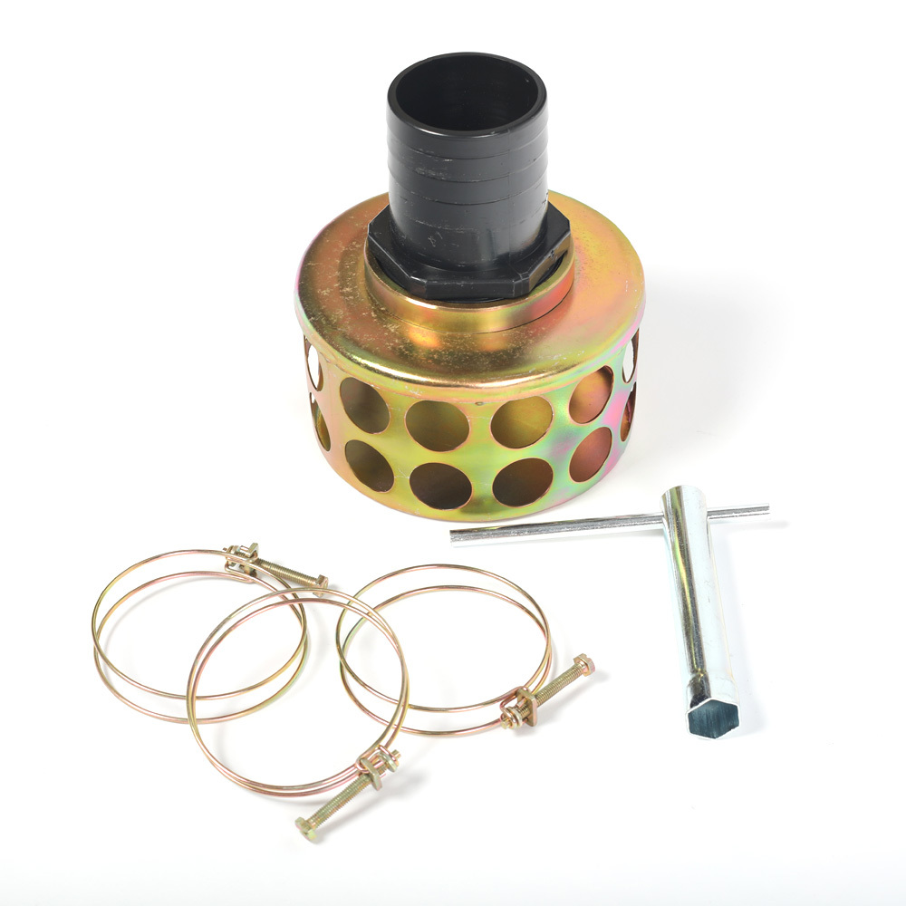 Комплект: переходники на всасывающий и подающий шланги, хомуты, сетка-фильтр на всасывающий шланг.