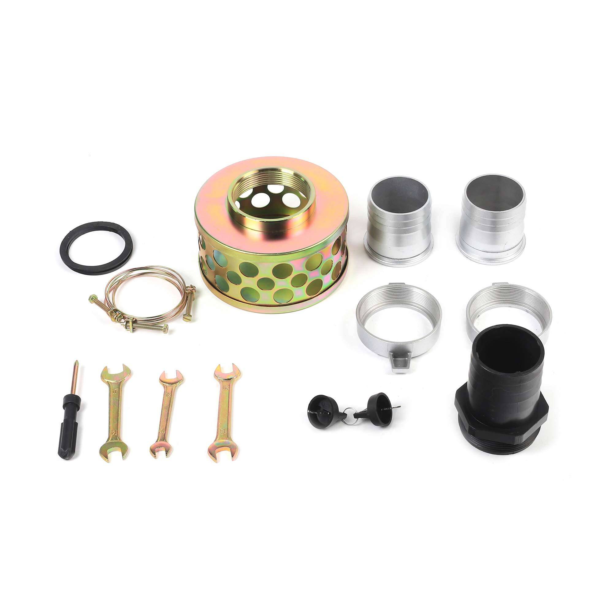 Комплект: переходники на всасывающий и подающий шланги, хомуты, сетка-фильтр на всасывающий шланг.