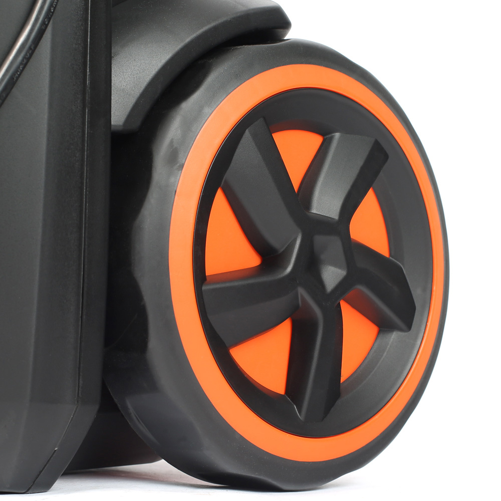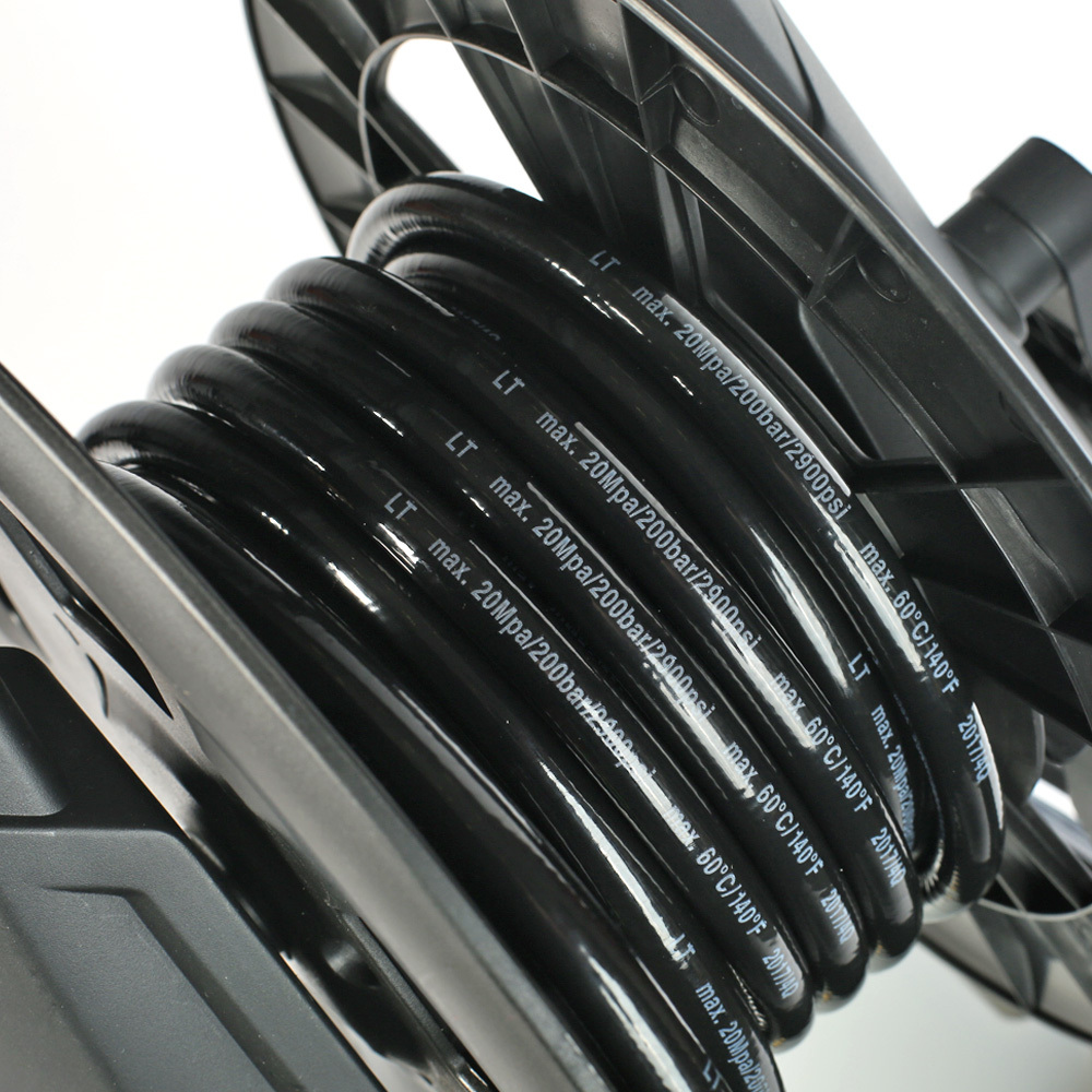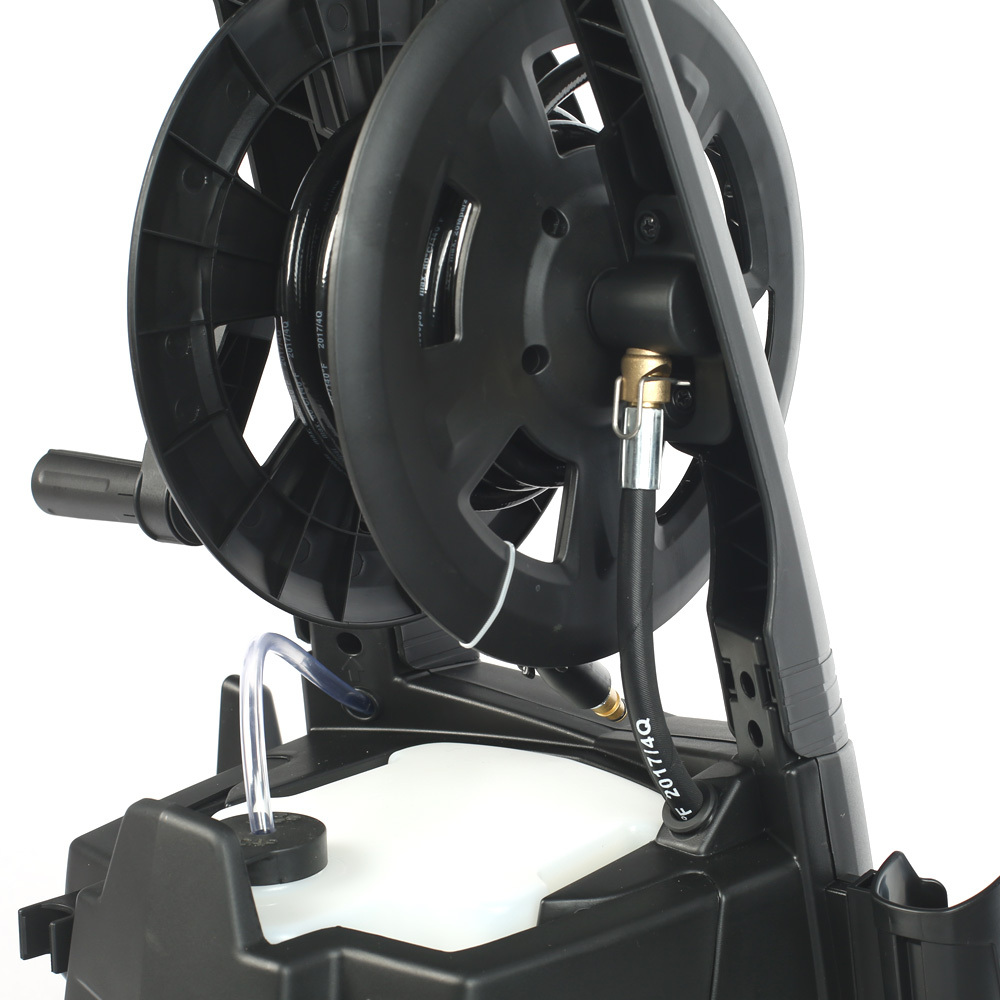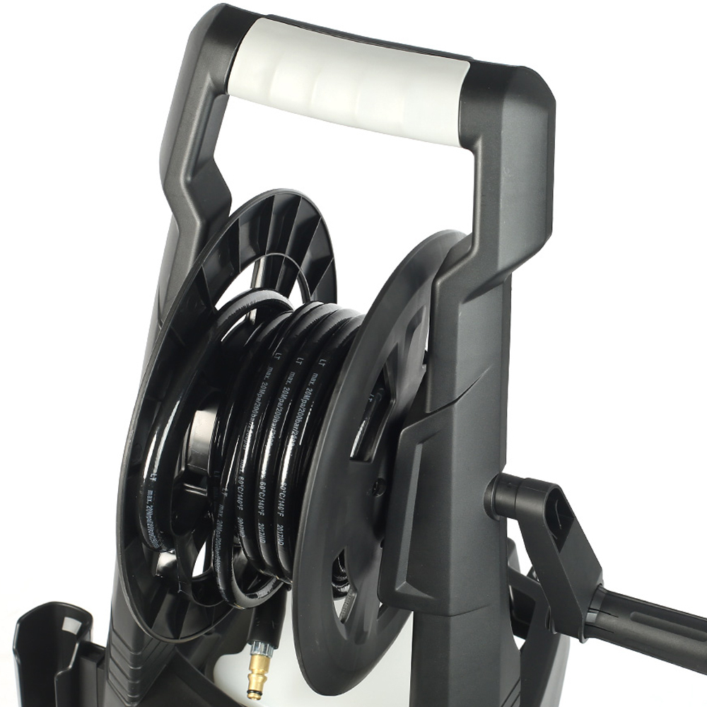 2200 Вт, 450 л/час, 150 бар, самовсасывающая, коллекторный, 7 м шланг армированный ПВХ, помпа из алюминия, поршни из стали, фильтр, колеса, катушка для шланга