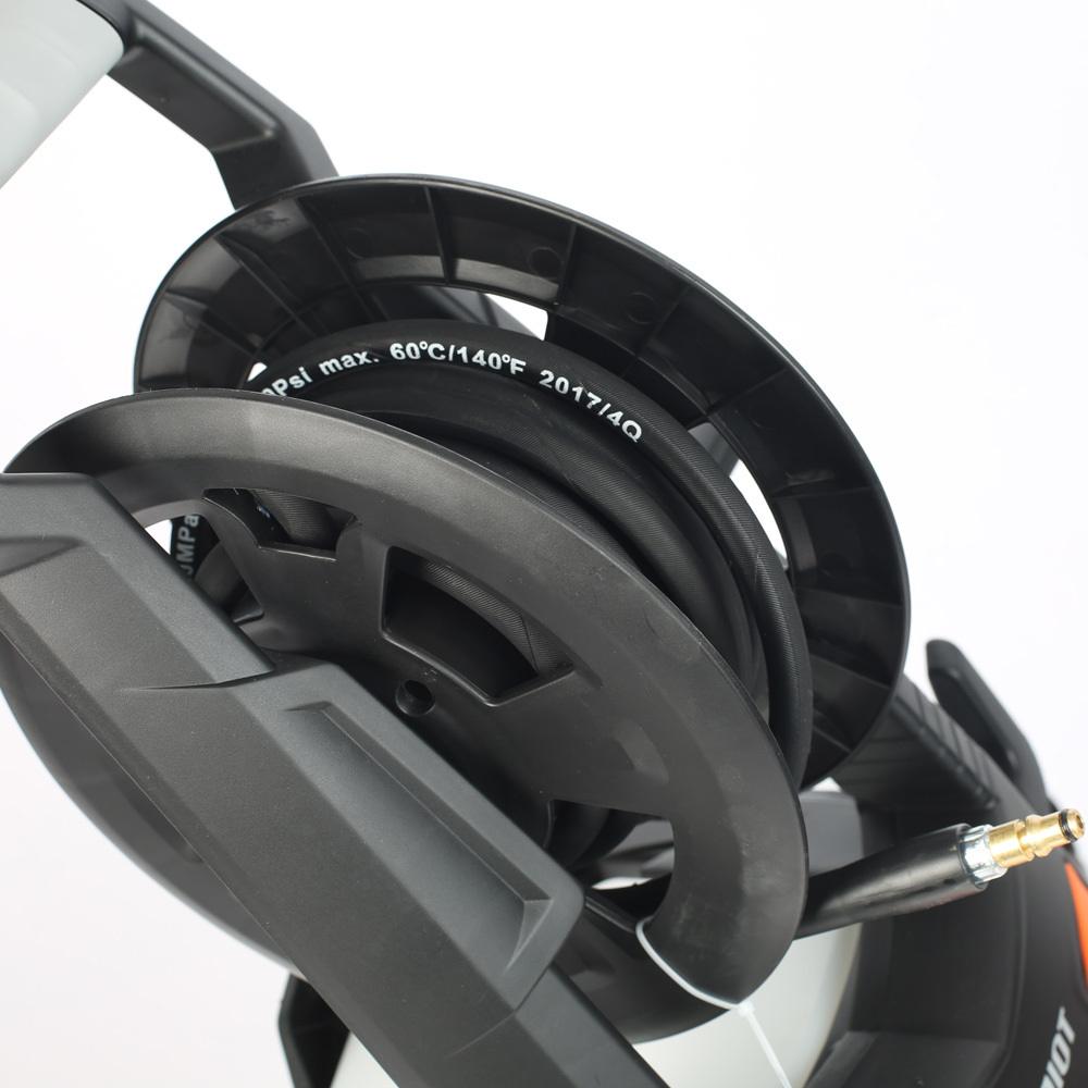 2600 Вт, 470 л/час, 170 бар, самовсасывающая, асинхронный, 8 м шланг армированный ПВХ, помпа из алюминия, поршни из стали, колеса, фильтр, катушка для шланга