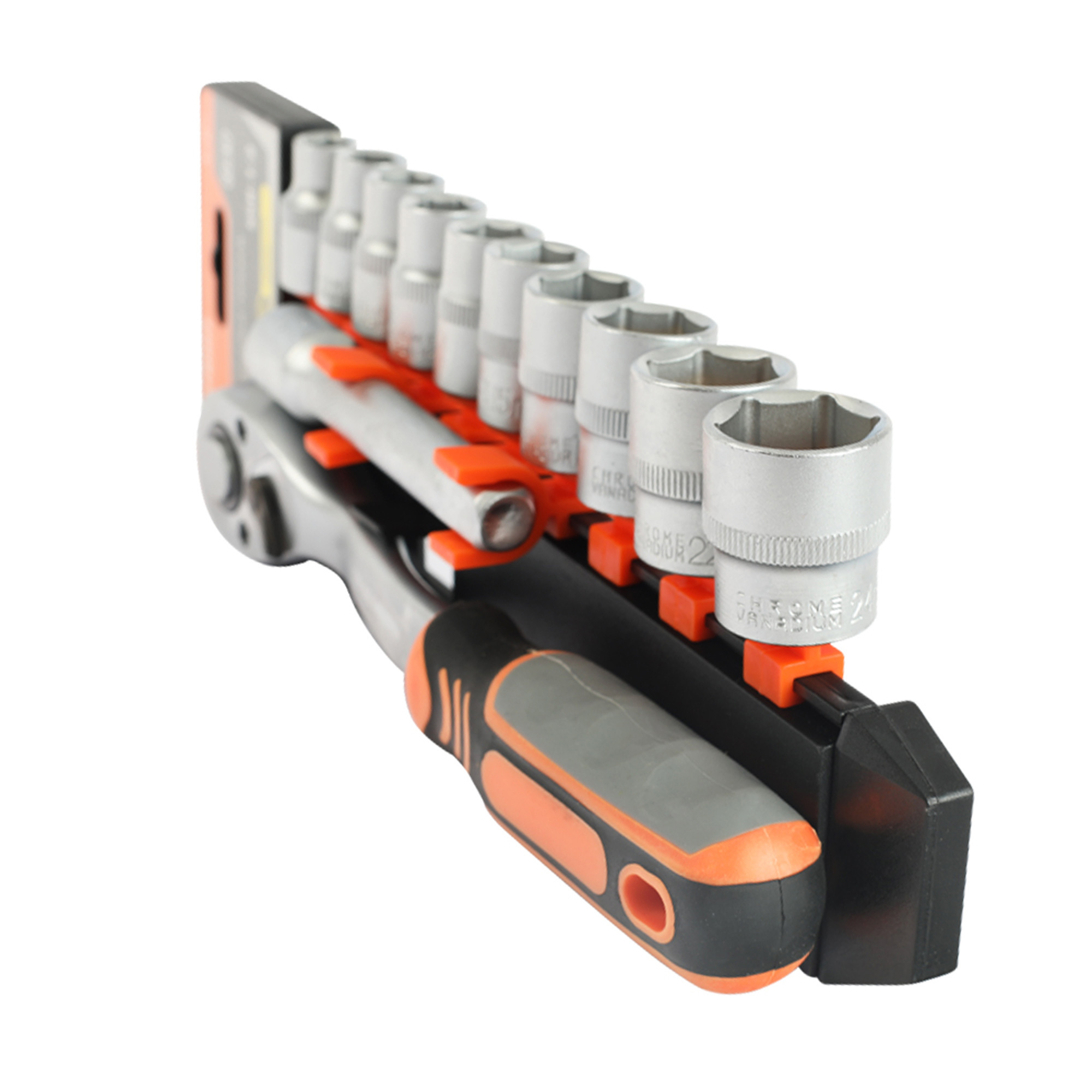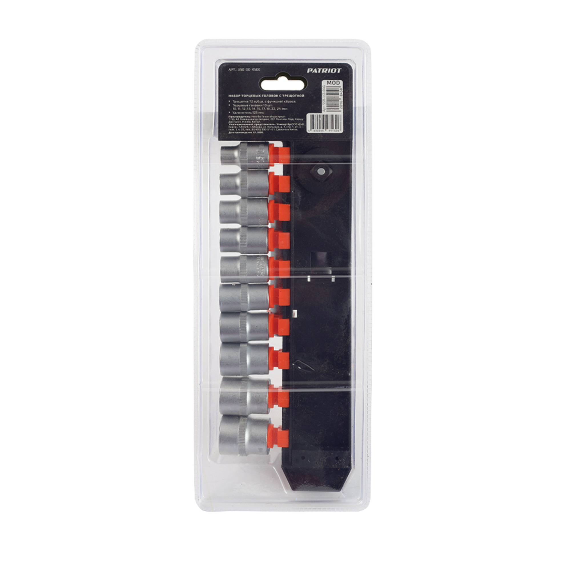 Трещотка 72 зубца; Торцевые головки 10 шт: 10, 11, 12, 13, 14, 15, 17, 19, 22, 24; Удлинитель 125 мм; Упаковка;