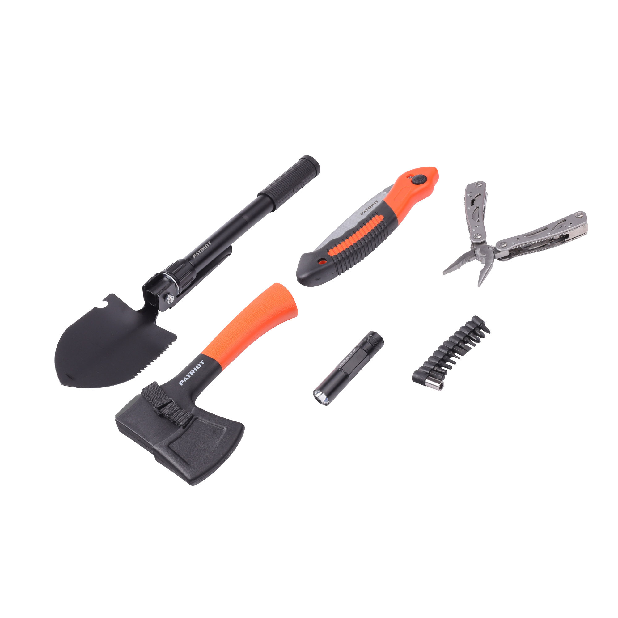 Набор универсальный Patriot KUP 6 предназначен для автомобилистов и туристов. Состав:  фонарь, лопата, мультитул с битами, пила и  топор.