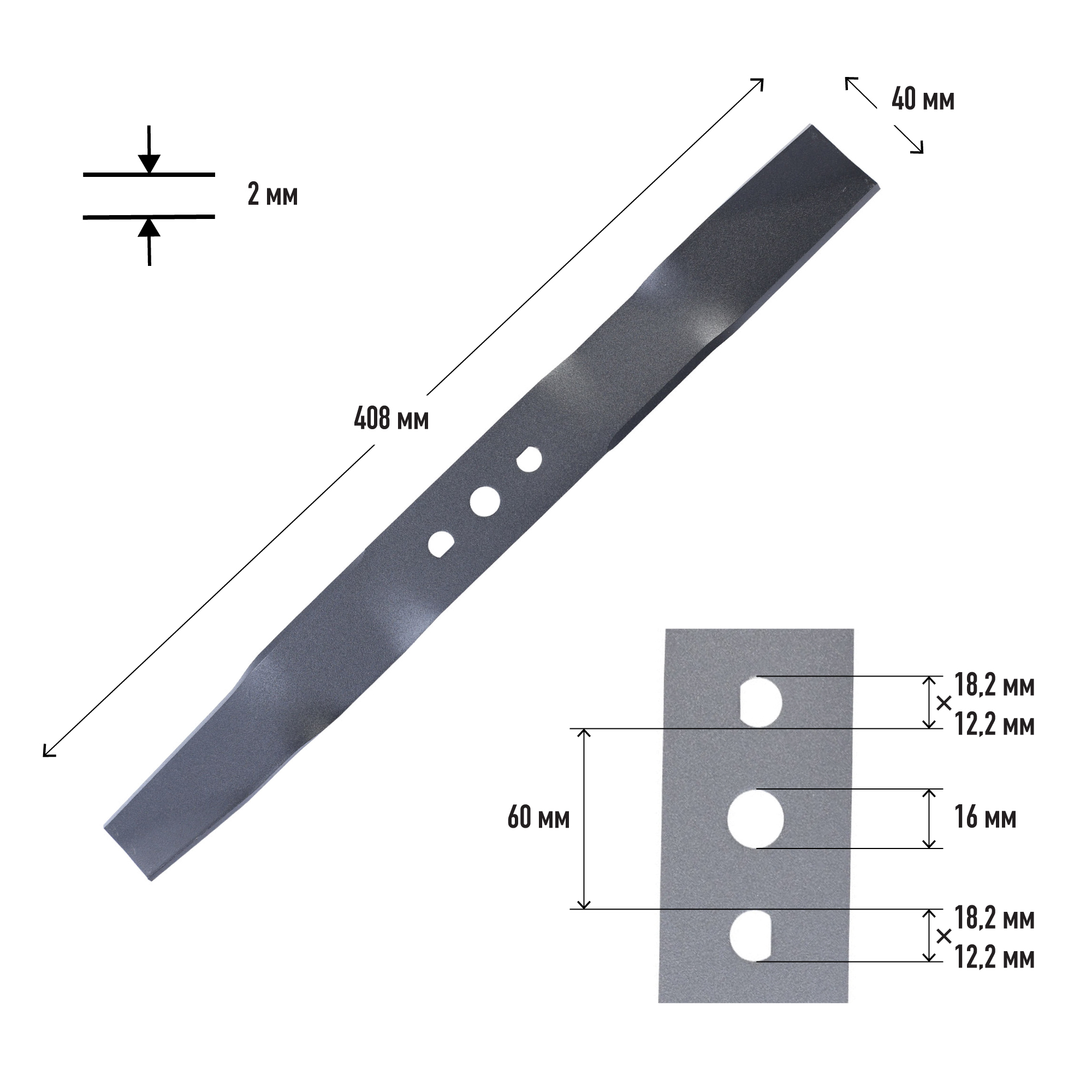 длина 408 мм, центральное 16 мм, ширина 40 мм, толщина 2 мм, межцентровое 60 мм, сталь