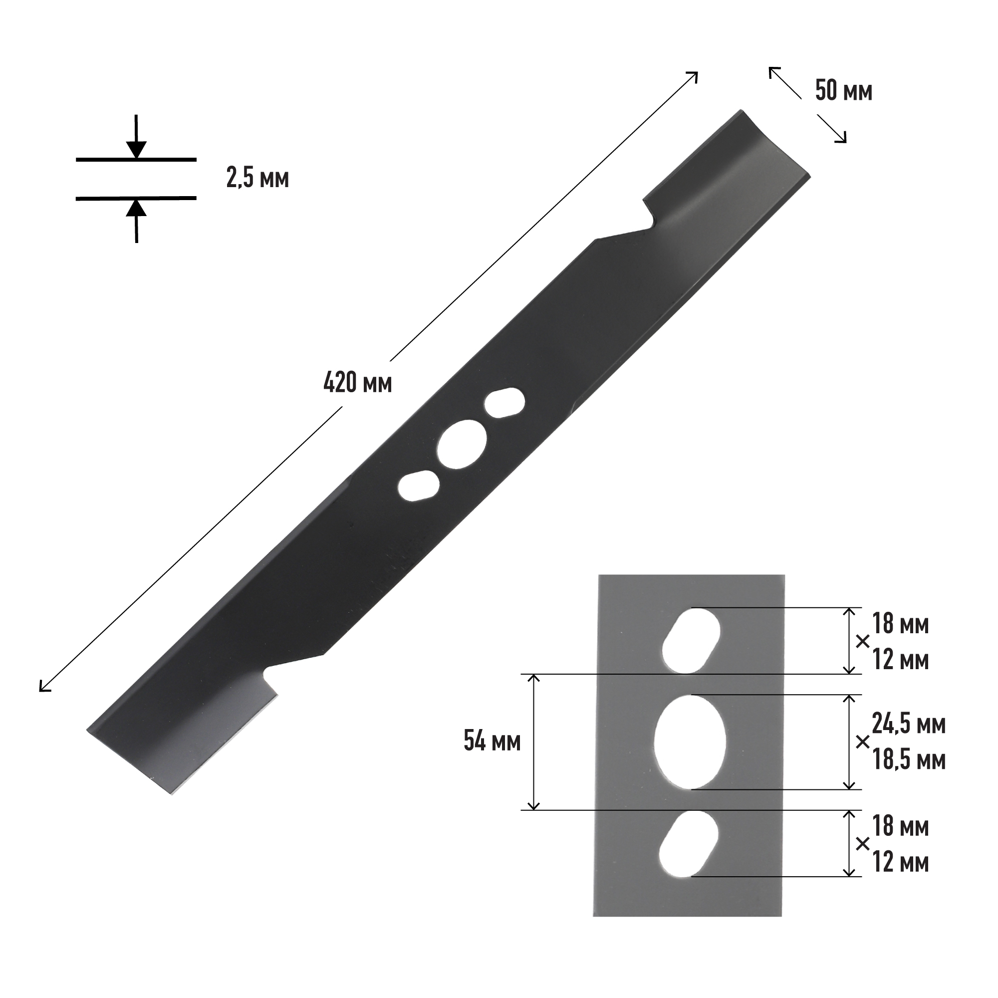 длина 420 мм, центральное 24.5х18.5 мм, ширина 50 мм, толщина 2.5 мм, межцентровое 54 мм, сталь
