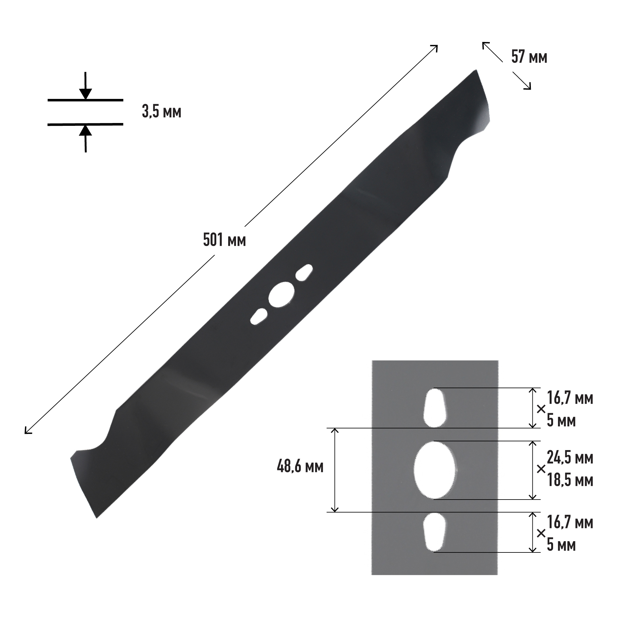 длина 501 мм, центральное 24.5х18.5 мм, ширина 57 мм, толщина 3.5 мм, межцентровое 48.6 мм, сталь