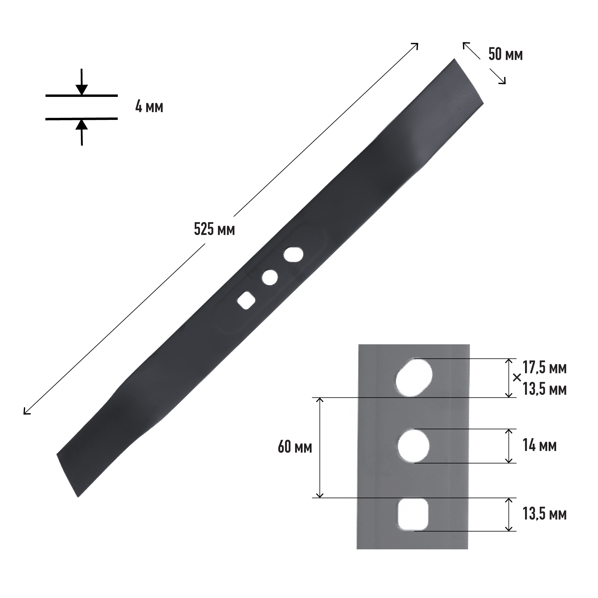 длина 525 мм, центральное 14 мм, ширина 50 мм, толщина 4 мм, межцентровое 60 мм, сталь