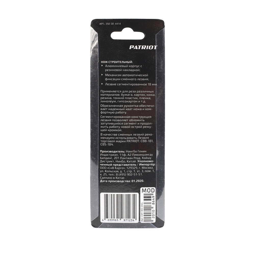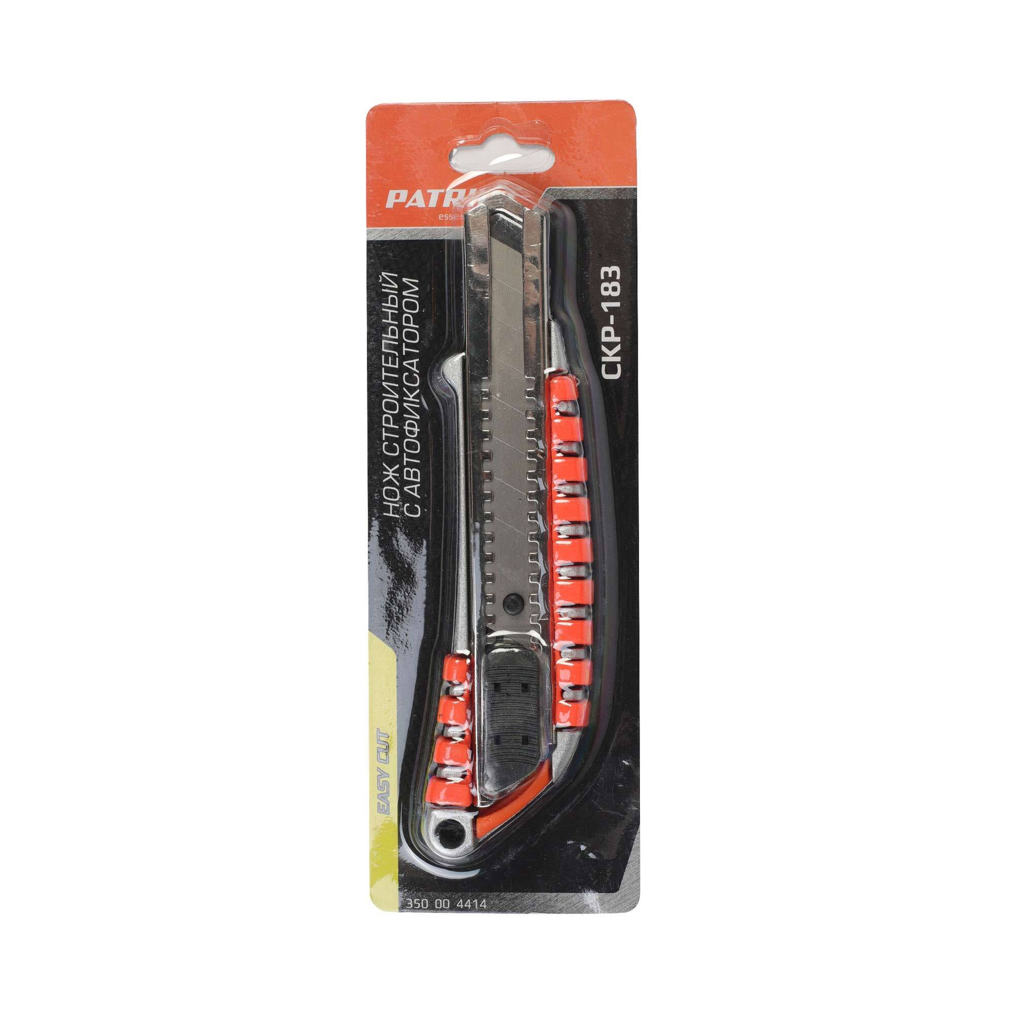 Нож строительный PATRIOT CKP-183 для работы с тонкими материалами. Стальные лезвия имеют сегментированную конструкцию: можно легко отколоть затупившийся сегмент. Ударопрочный выдвижной корпус выполнен из алюминия с резиновыми вставками и оснащён автофикстатором. К ножу подходят наборы сменных лезвий PATRIOT CBS-184 и CBB-181.