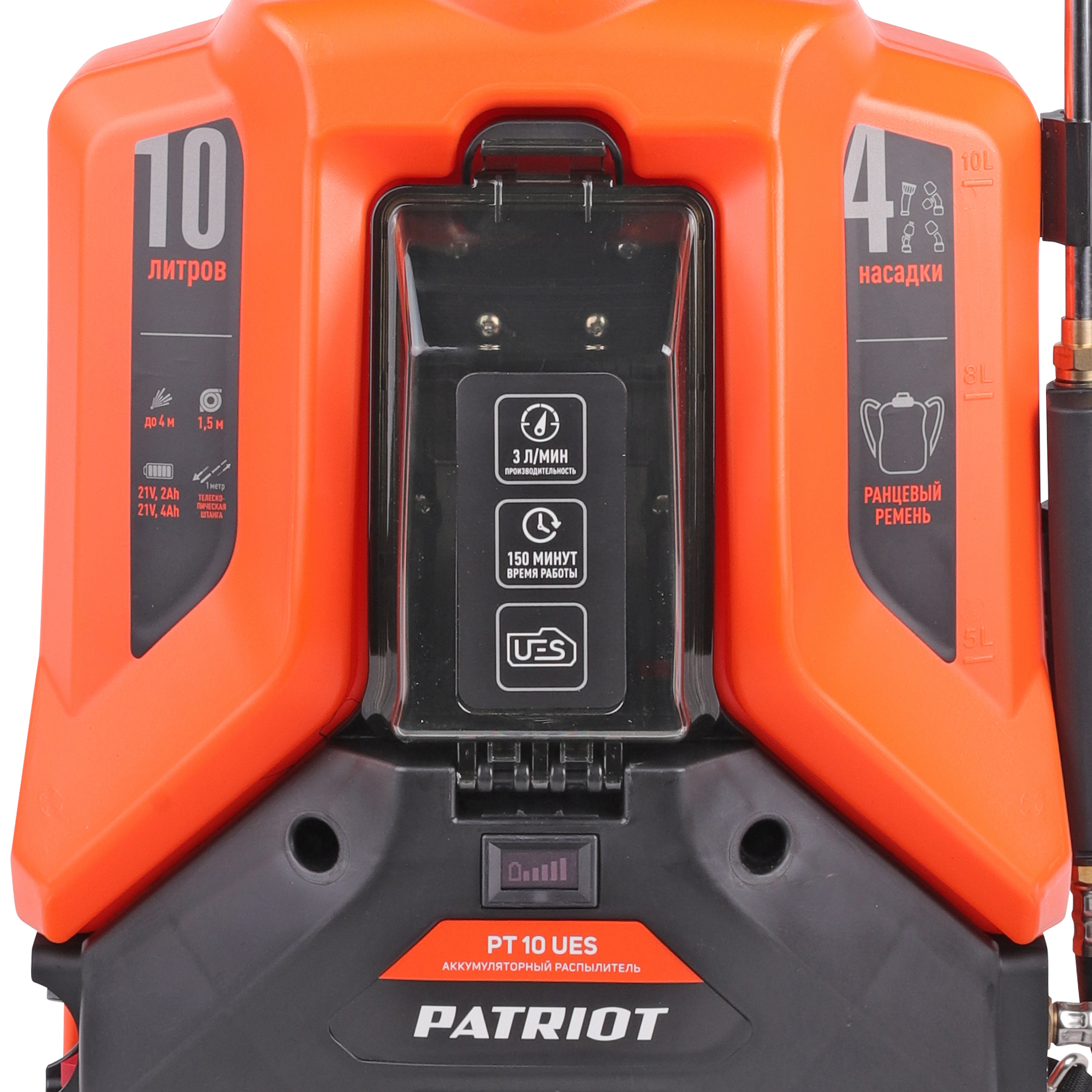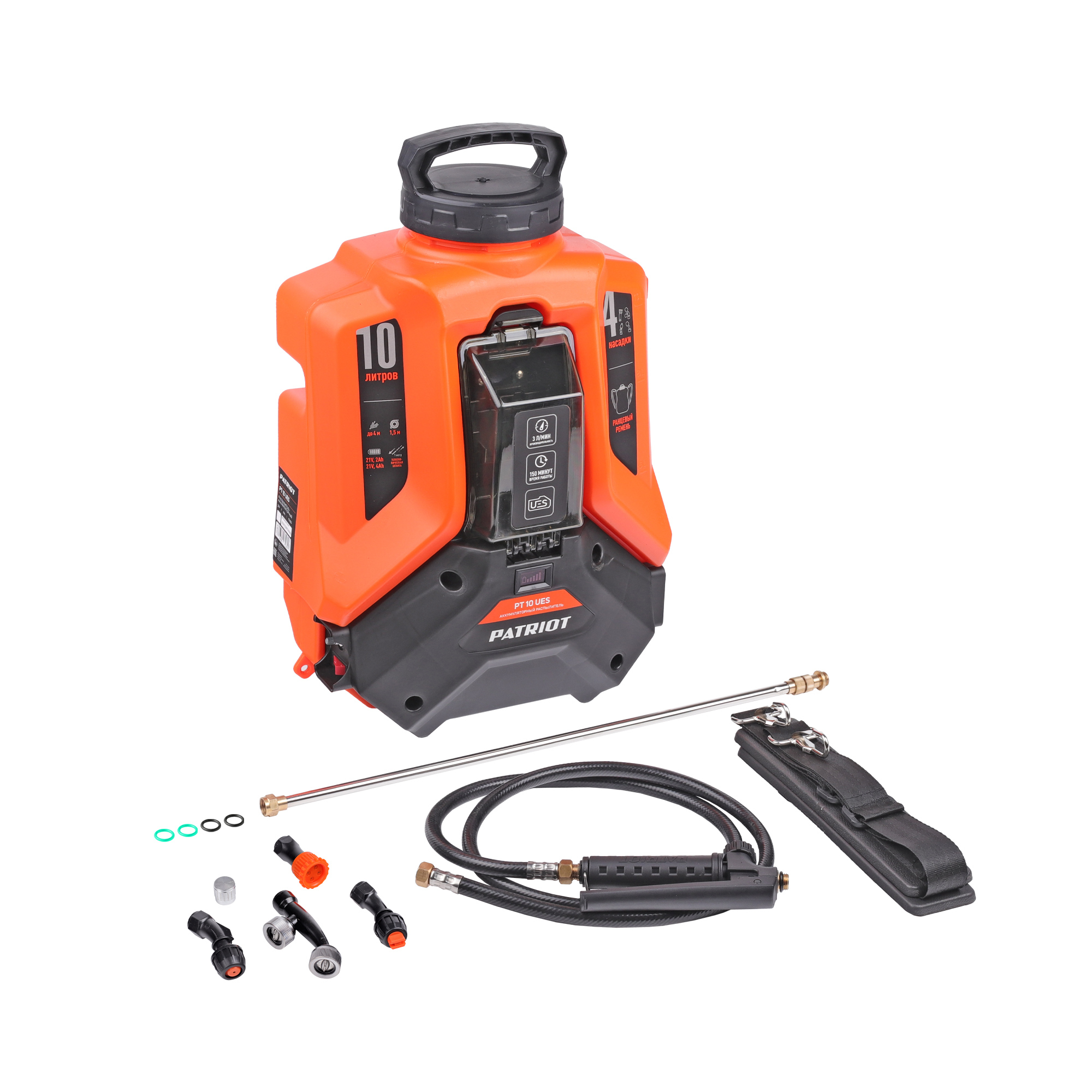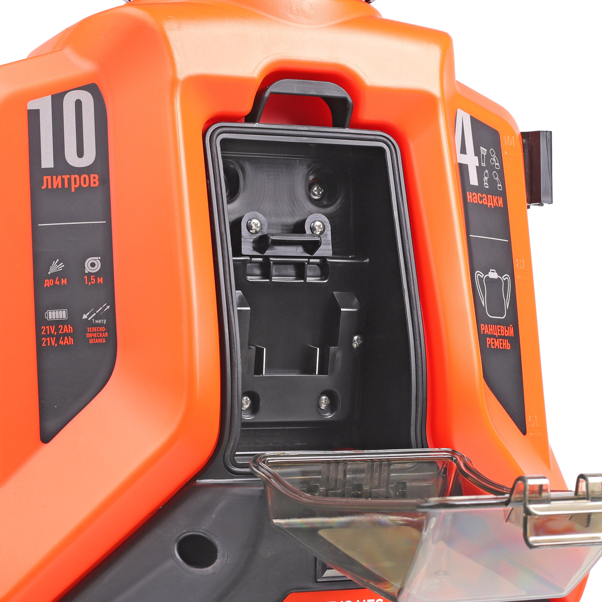 21 В, Li-ion, производительность 3 л/мин, дальность распыления 5 м, бак 10 л, ранцевый ремень, длина шланга 1.5 м, длина штанги 1 м, телескопическая штанга, насадки 4 шт. в комплекте