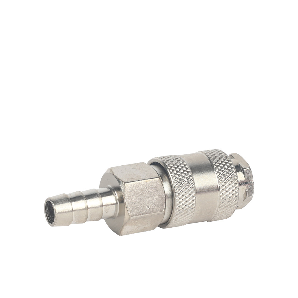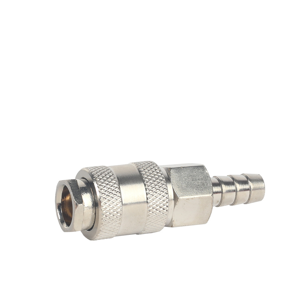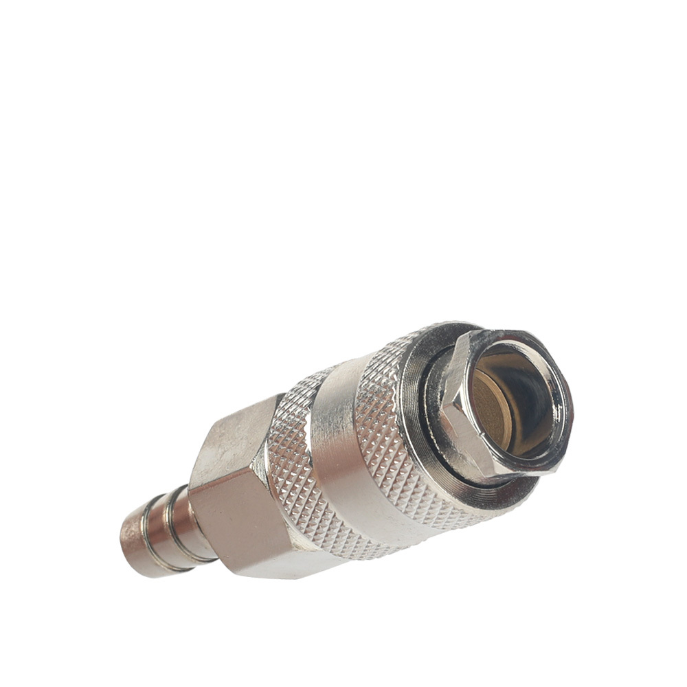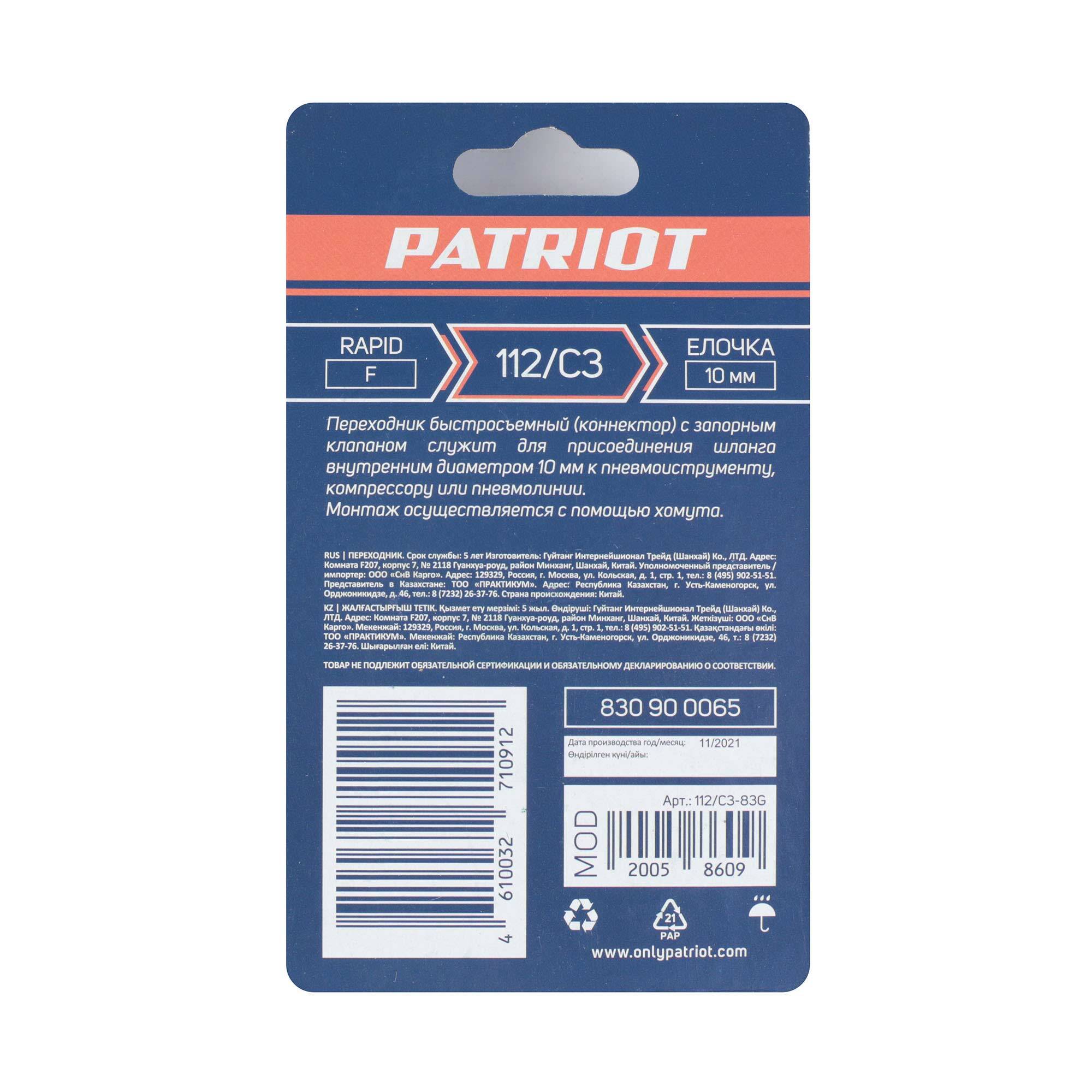 Быстросъёмный переходник PATRIOT 112/С3 с запорным клапаном для присоединения шланга к пневмоинструменту, компрессору или пневмолинии. Переход рапид - «елочка» 10 мм. Монтаж осуществляется с помощью хомута.