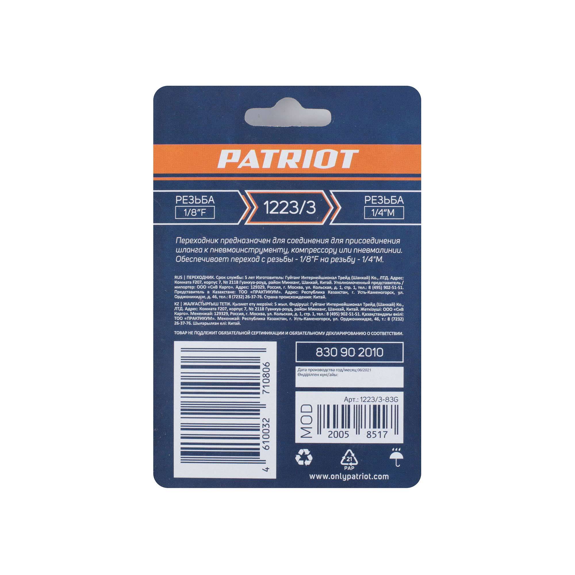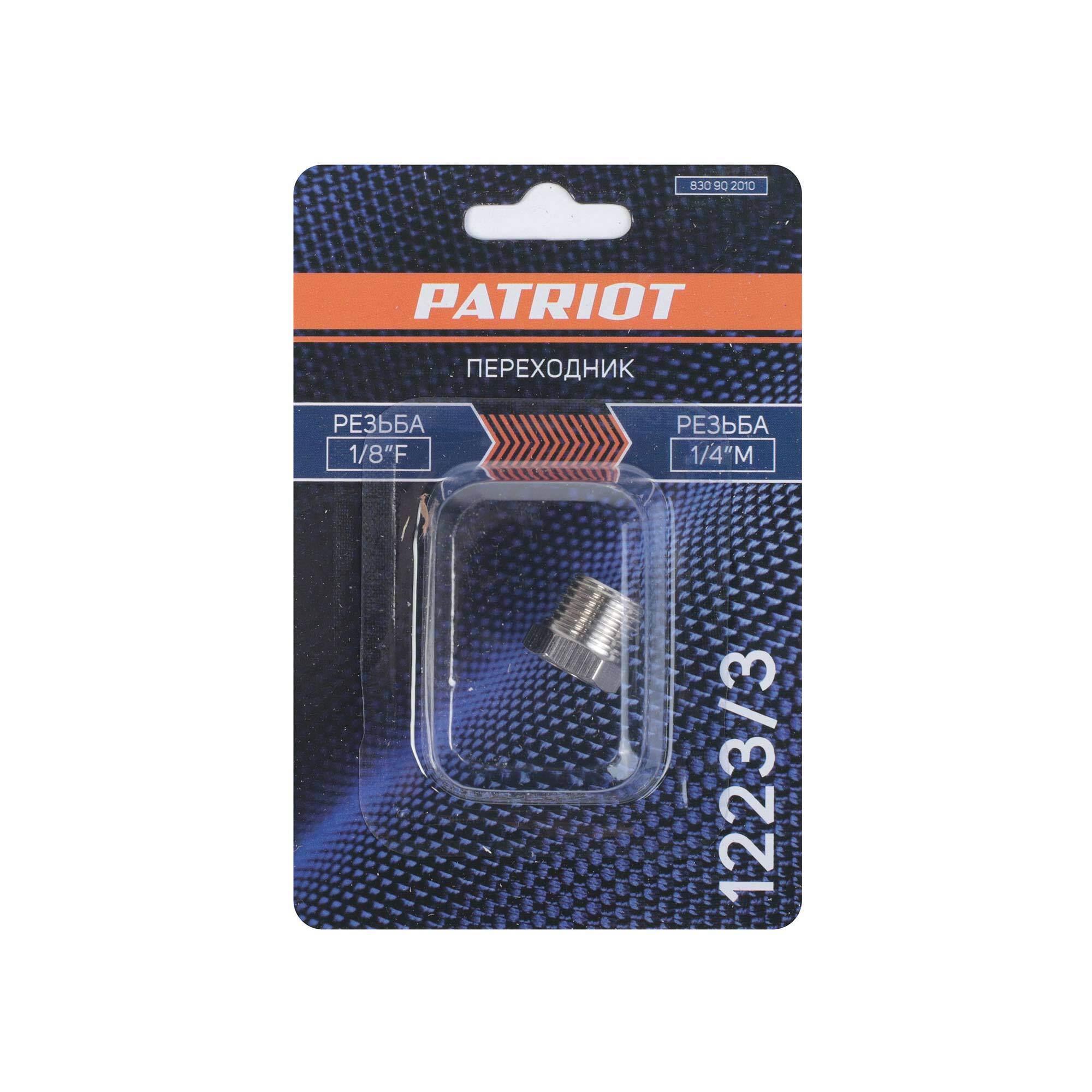 Переходник PATRIOT 1223/3 для соединения или присоединения шланга к пневмоинструменту, компрессору или пневмолинии. Переход с внешней резьбы 1/4 дюйма (6,35 мм) на внутреннюю 1/8 (3,17 мм).