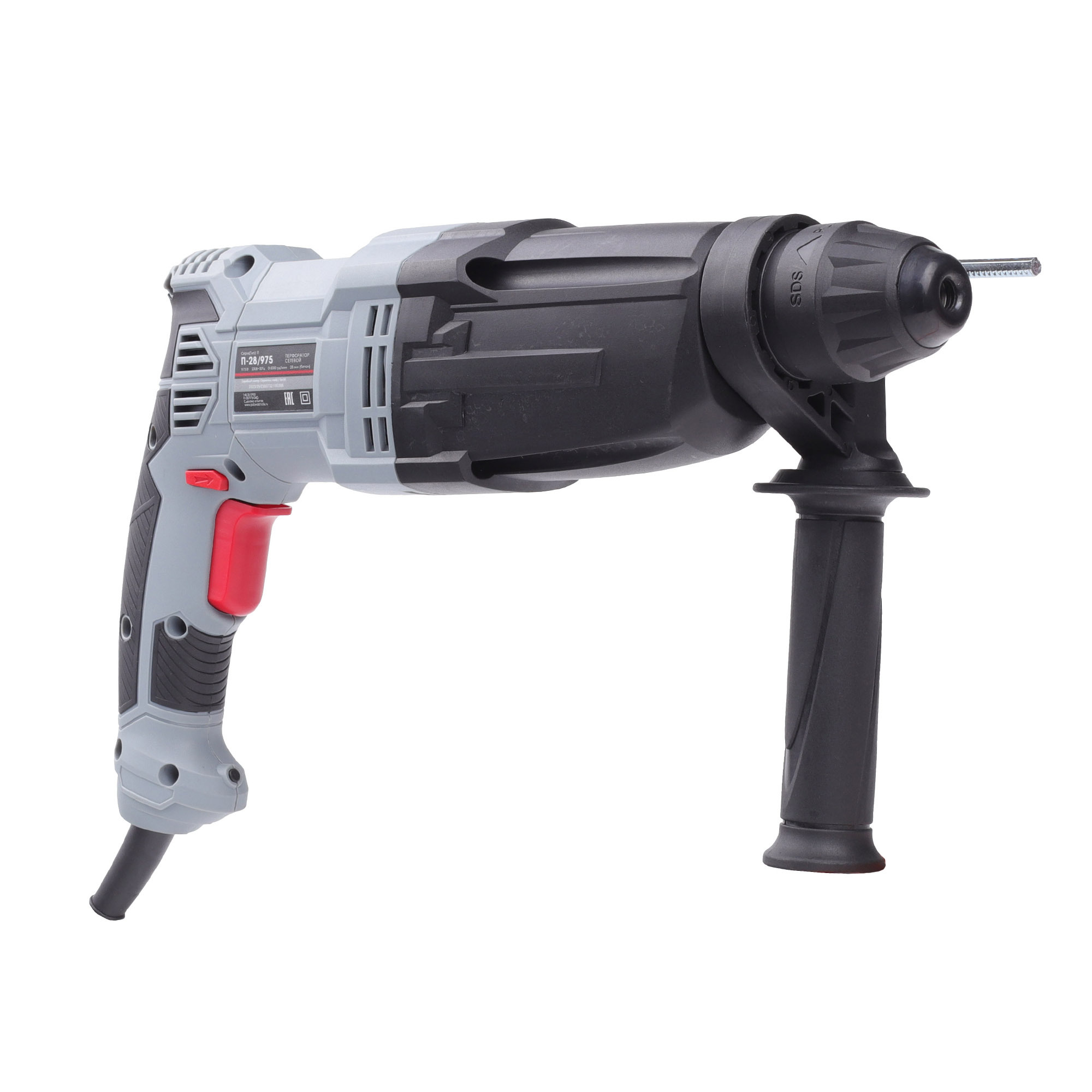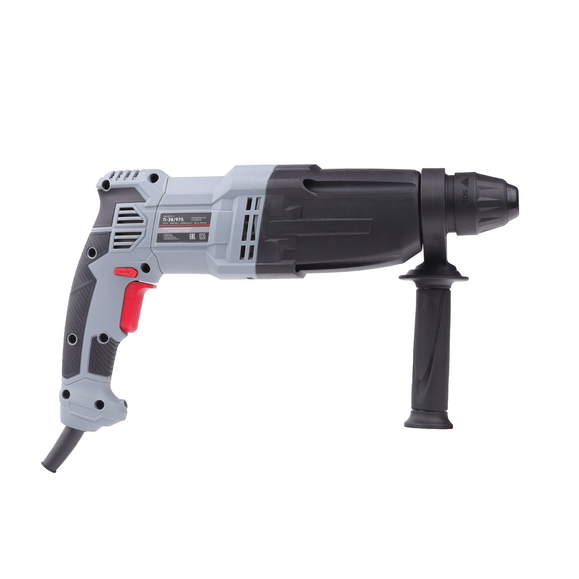 975 Вт, 0-5300 уд/мин, 0-1200 об/мин, макс. диаметр 28 мм, сила удара 3 Дж, патрон SDS-plus, 3 режима работы, реверс, дополнительная рукоятка+глубиномер, комплект буров и долот, кейс