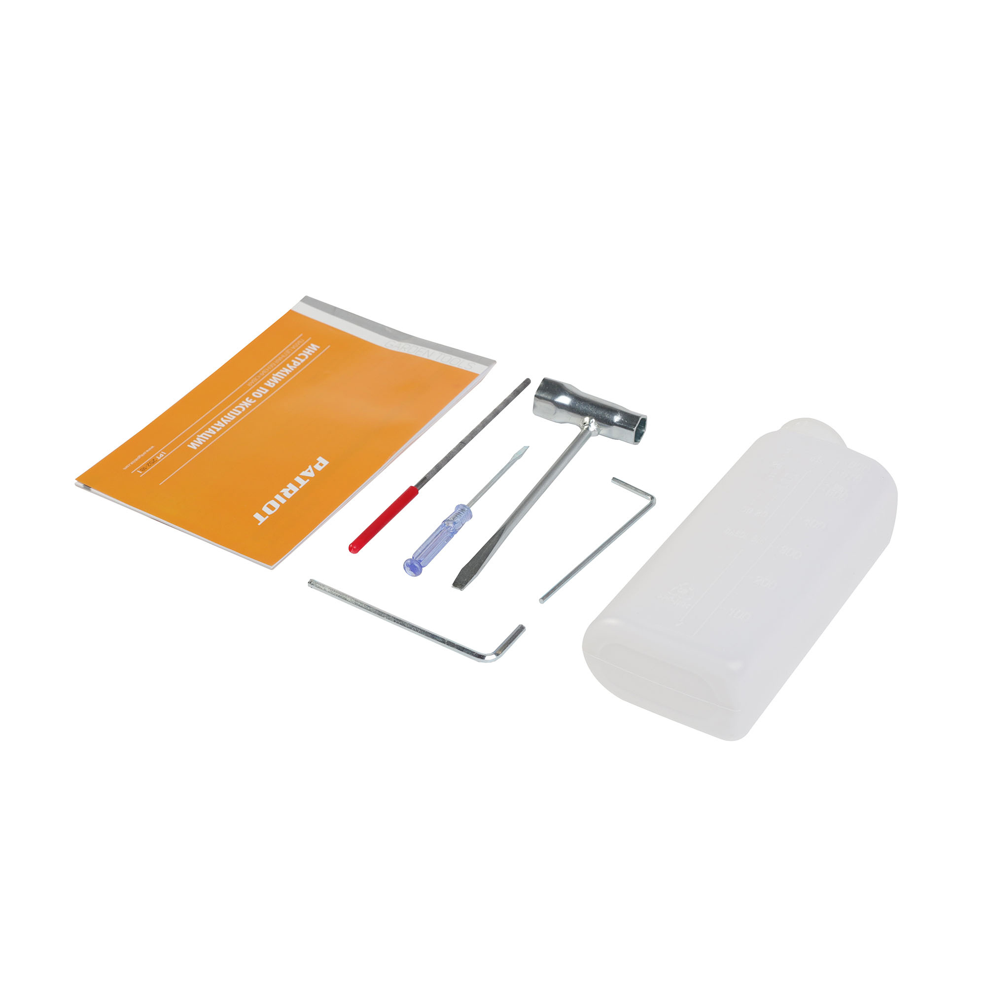 В комплекте поставки - емкость для смешивания топливной смеси, напильник для заточки цепи, необходимый для обслуживания набор инструмента.