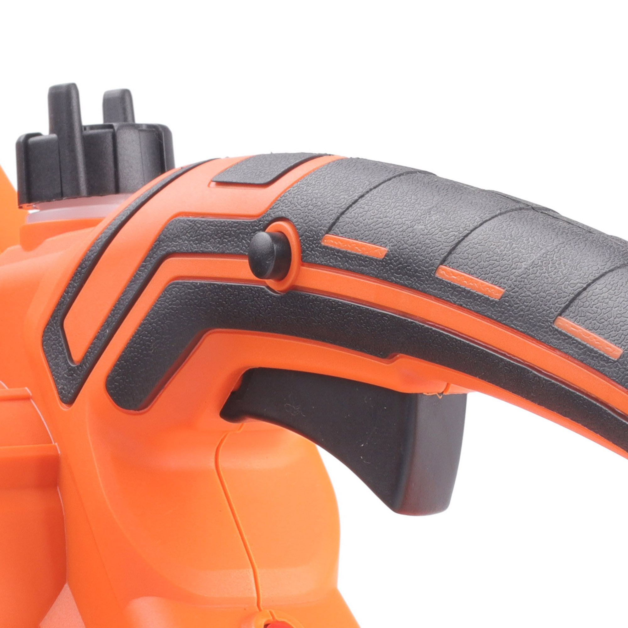 Уровень цепного масла можно определить по внешнему индикатору во встроенном баке. Пила оснащена предохранителем клавиши старта. На рукоятке предусмотрена скоба крепления сетевого кабеля.