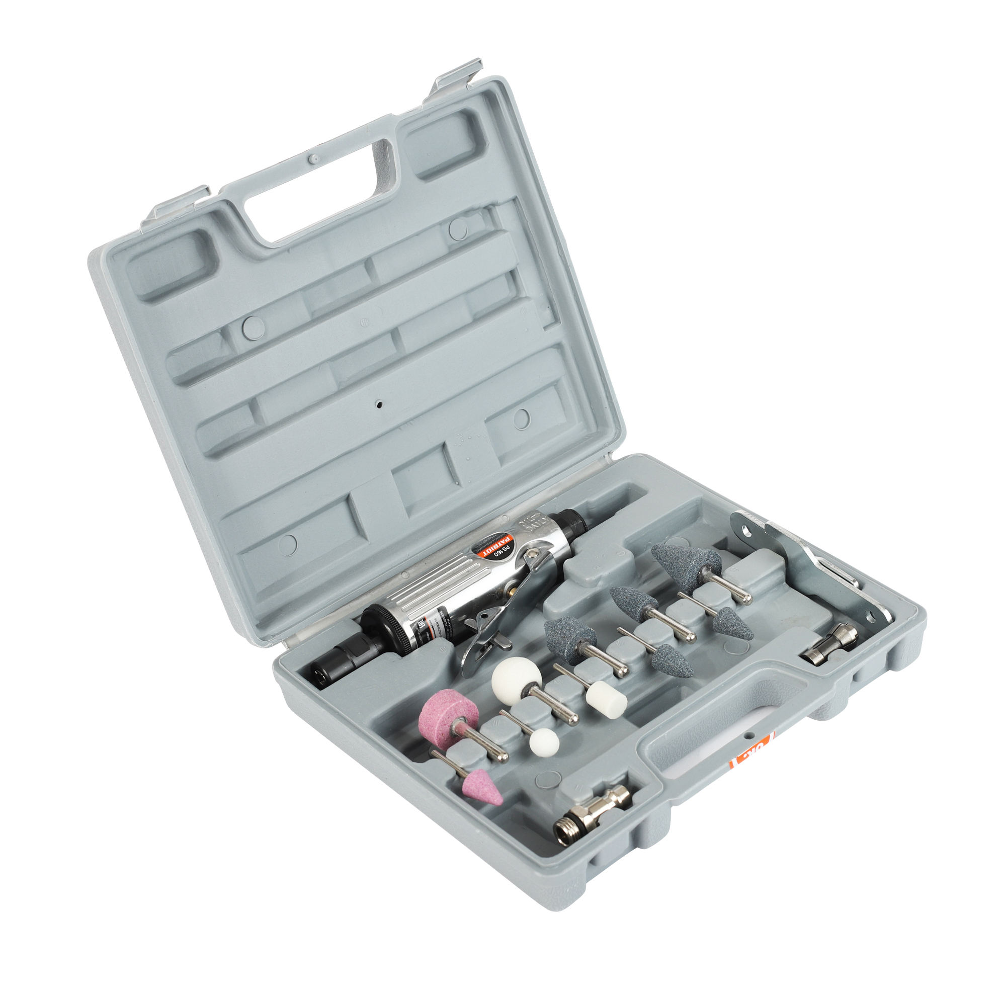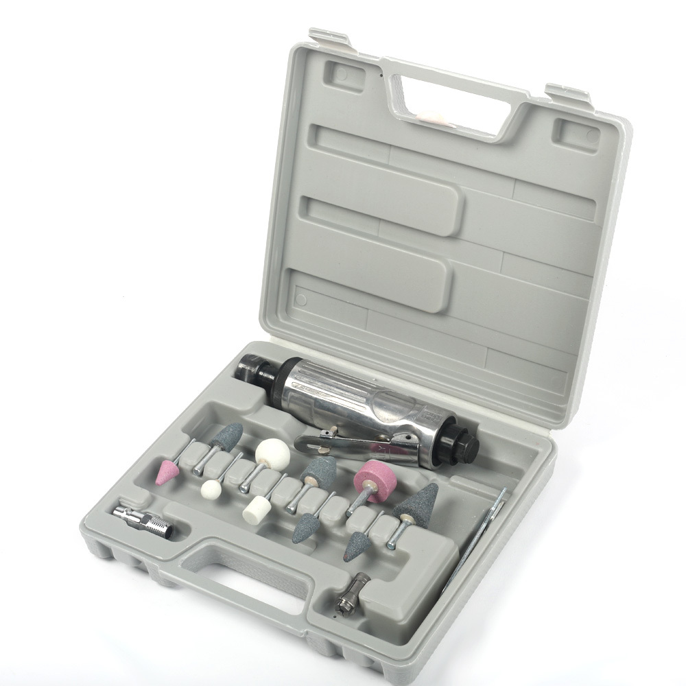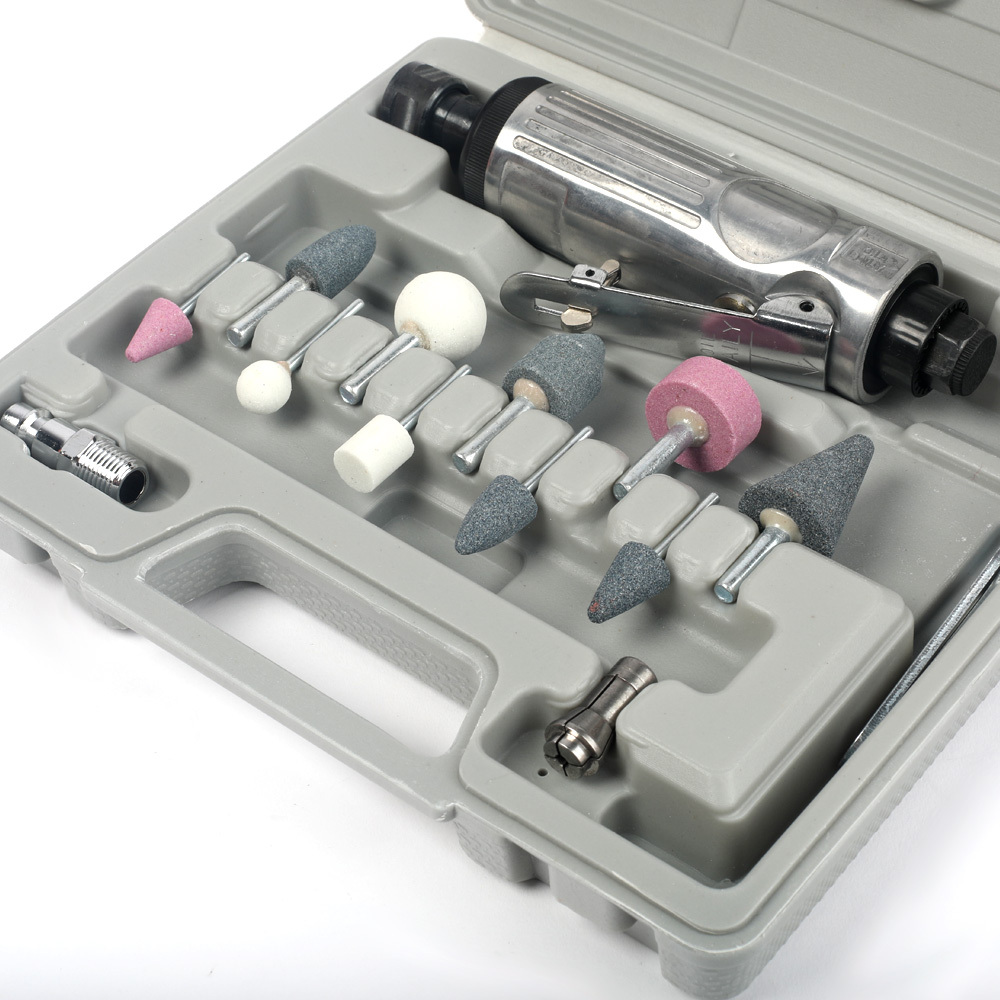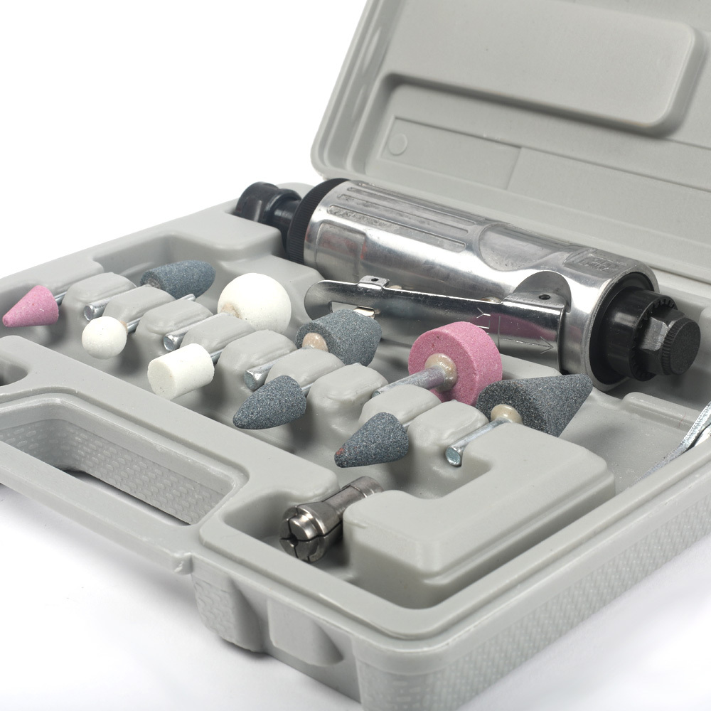 Пневмошлифмашина; Гаечный ключ: 2 шт.; Камни 3 мм: 5 шт.; Камни 6 мм: 5 шт.; Втулка (цанга) 3 мм; Втулка (цанга) 6 мм; Переходник резьба/быстросъемник; Инструкция по эксплуатации;