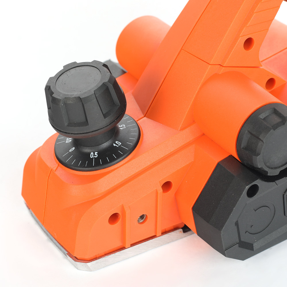 • Удобный поворотный механизм регулировки глубины строгания, совмещенный с дополнительной рукояткой.