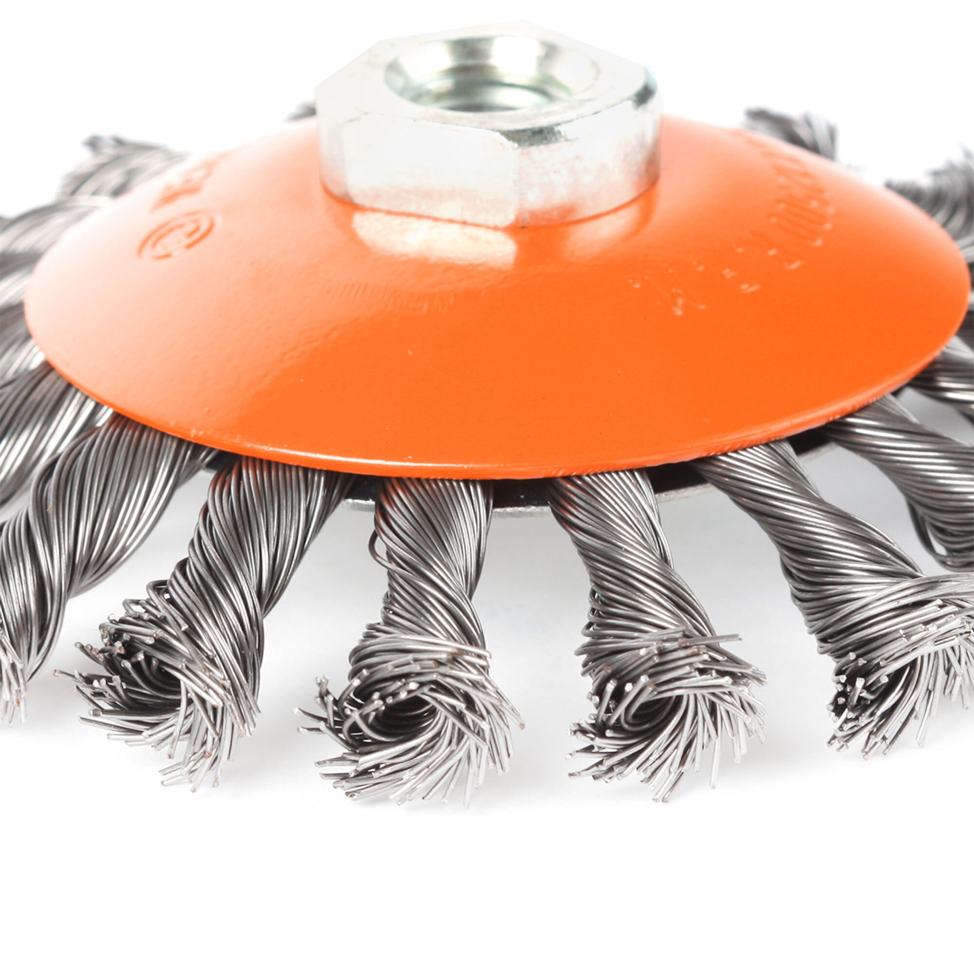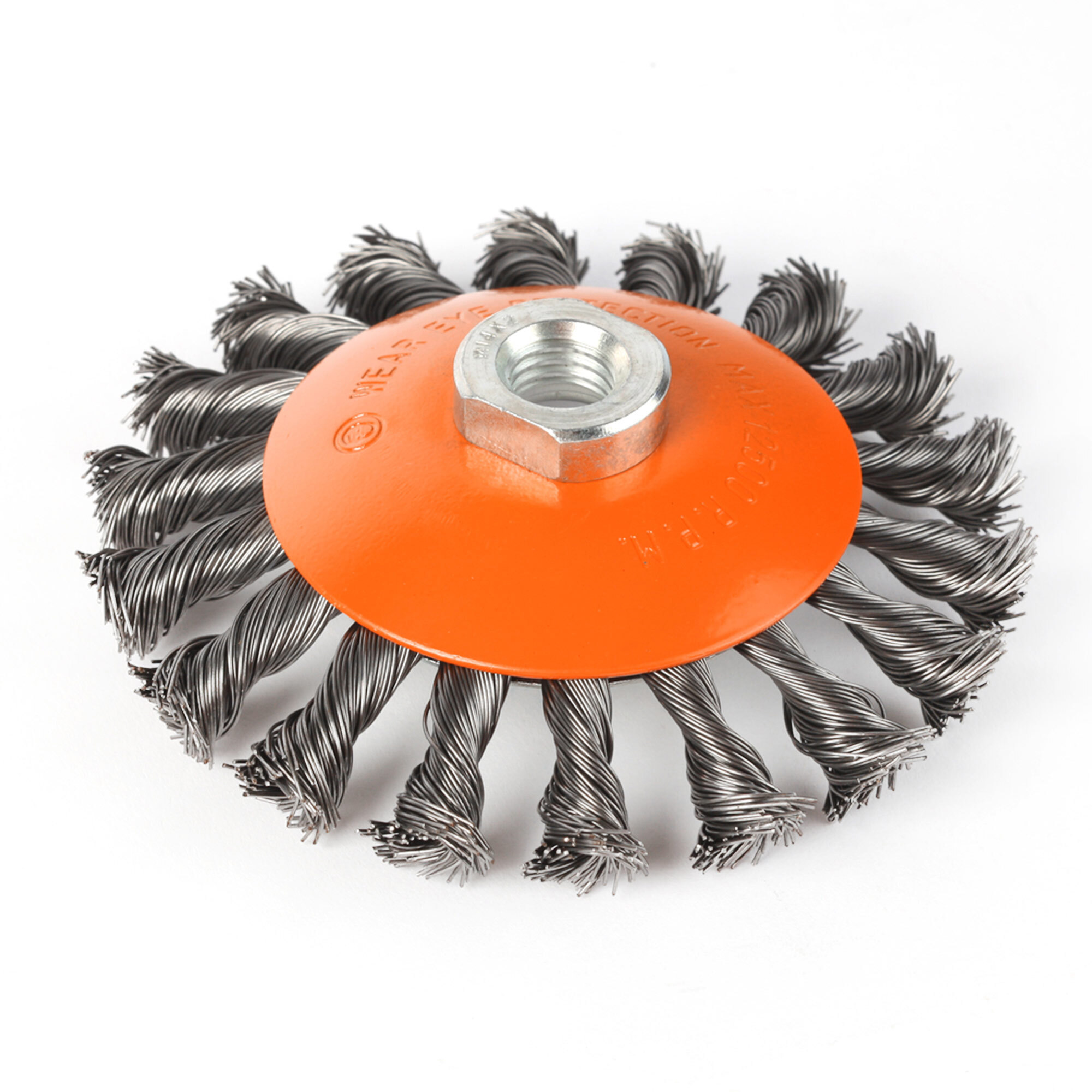 тарельчатая проволочная щетка для УШМ для снятия лака; краски; зачистки ржавчины; Наружный диаметр: 115мм; посадка: М14; витая проволока; высокая производительность; грубая зачистка
