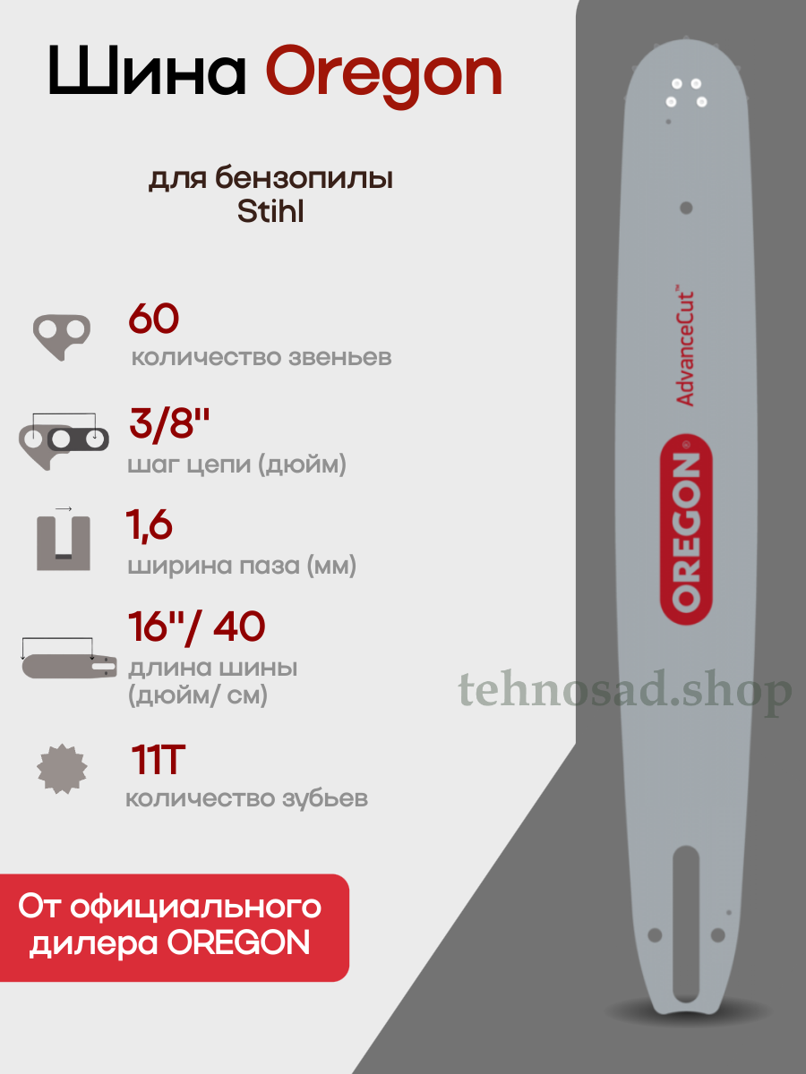 Шина пильная Oregon 163SFHD025 AdvanceCut Pro-Am длина 16"(40 см), паз 1,6 мм (0,063"), шаг 3/8", хвостовик D025, для цепи 60 зв. Для пил Stihl MS 310, 361, 362, 462, 500i, 660, 661. Аналог Stihl 3003-000-5213 , 3003-000-6113