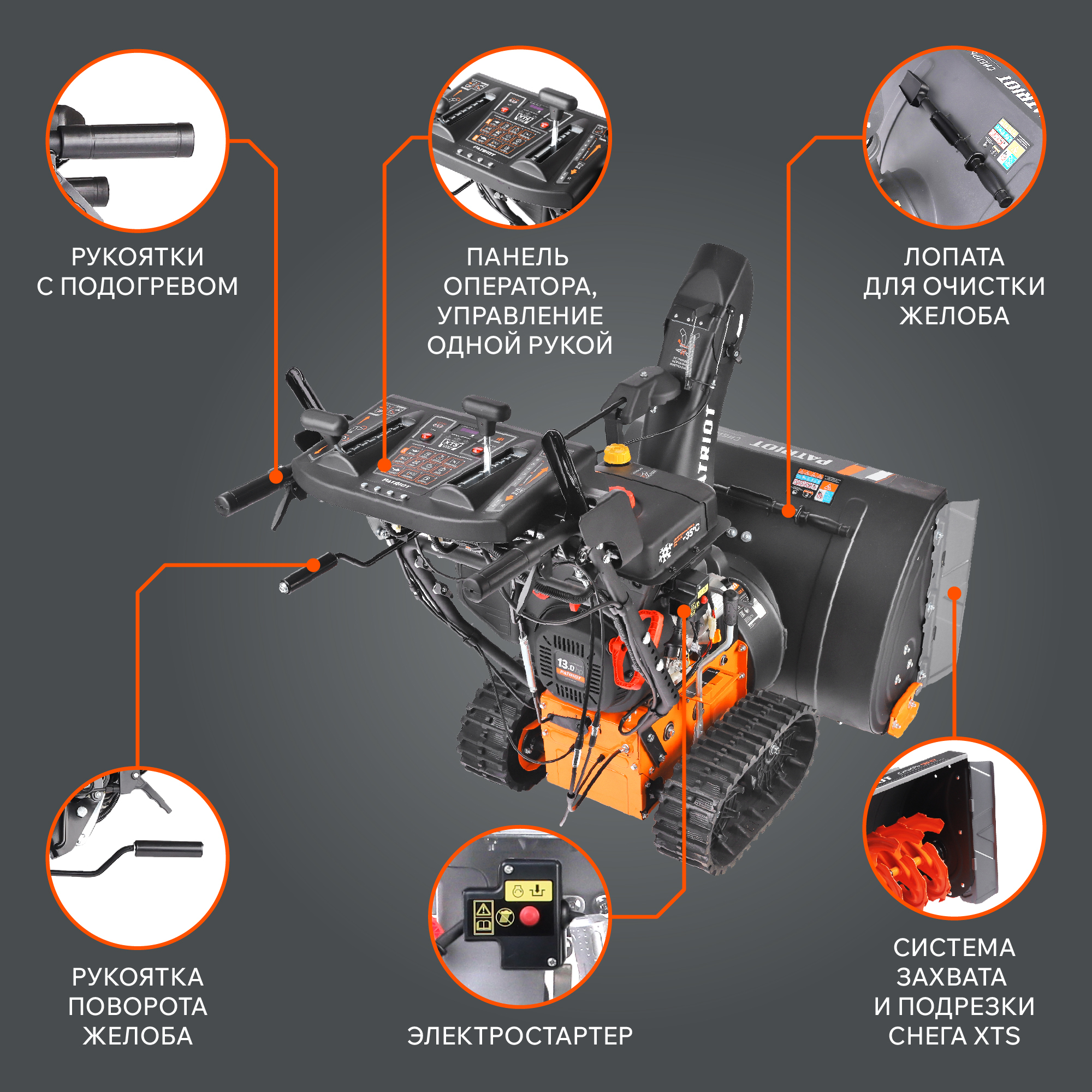 Высокопроизводительный снегоуборщик на гусеничном ходу PATRIOT Сибирь 130 ЕТ подходит для уборки снега и расчистки снежных заносов. Высокий зубчатый шнек с агрессивным дизайном перемалывает любой вид снега, включая сырой и обледеневший. Система XTS расширяет возможности для уборки на 10%, увеличивая площадь и высоту захвата. «Зимний» двигатель защищен от сильных морозов до -35 градусов, а функция электростарта позволяет запустить его по нажатию одной кнопки. Для работы в темное время модель оснащена LED фарой. Управление вынесено на отдельную панель, дающую быстрый доступ ко всем его элементам.