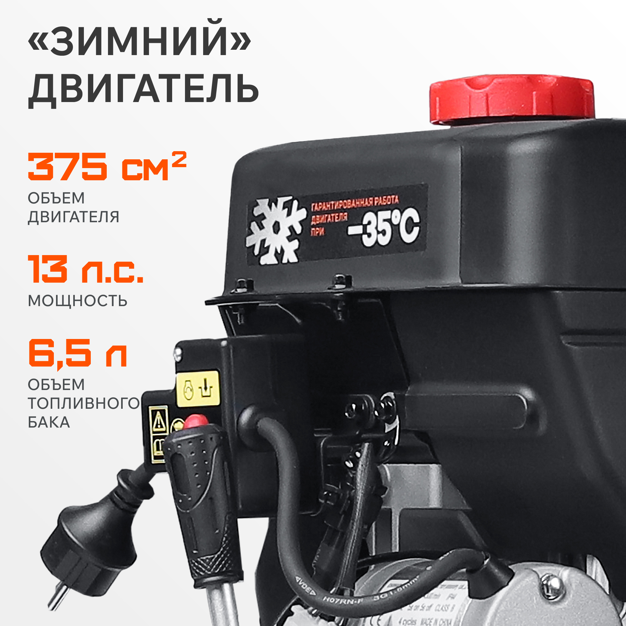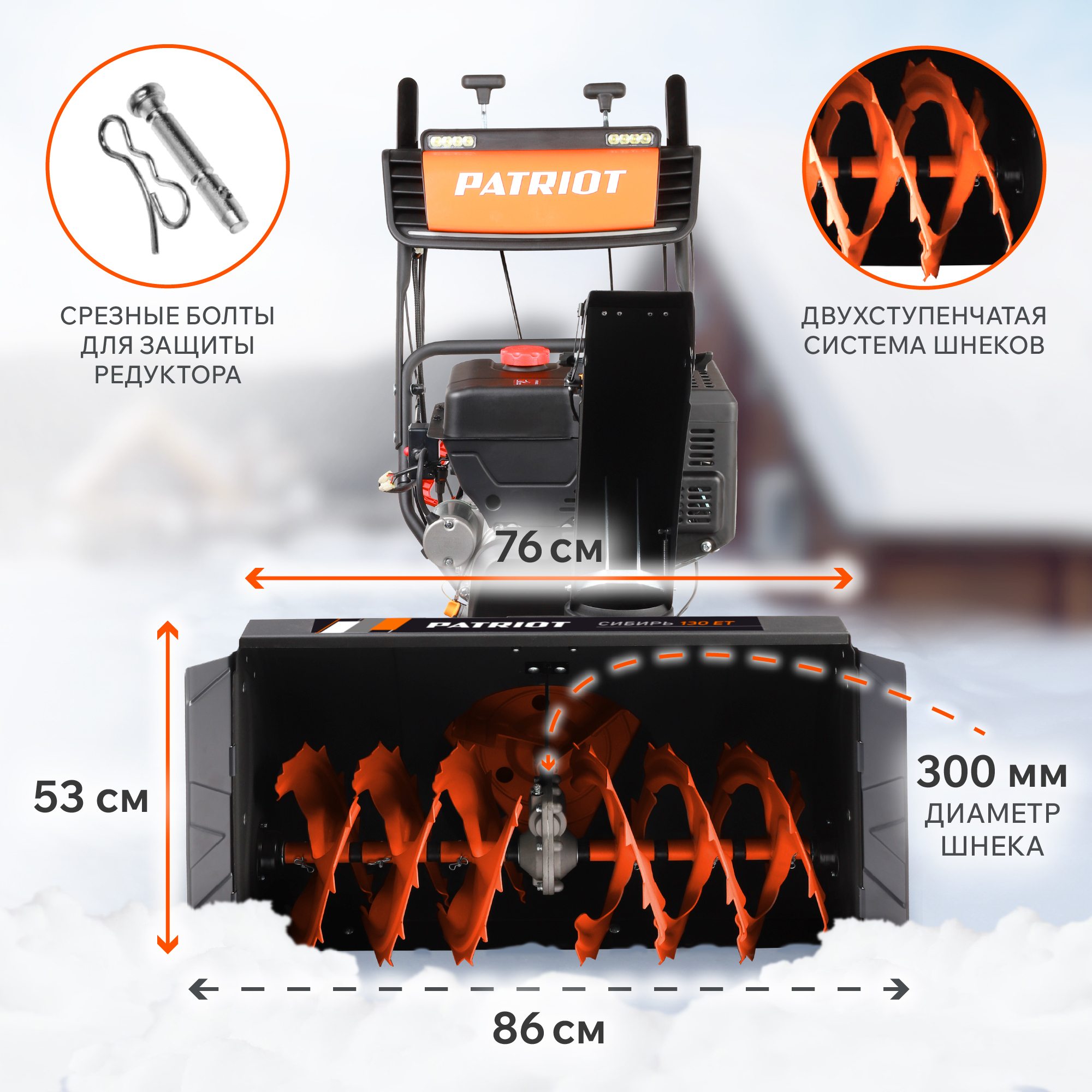13 л.с, 375 см.куб, бак 5.5 л, 4-х тактный двигатель, картер 1.3 л, металлический шнек, ширина обработки 86 см, высота обработки 53 см, диаметр шнека 300 мм, 12 м дальность, 6 вперед/2 назад, эл.стартер, гусеницы, фара+подогрев