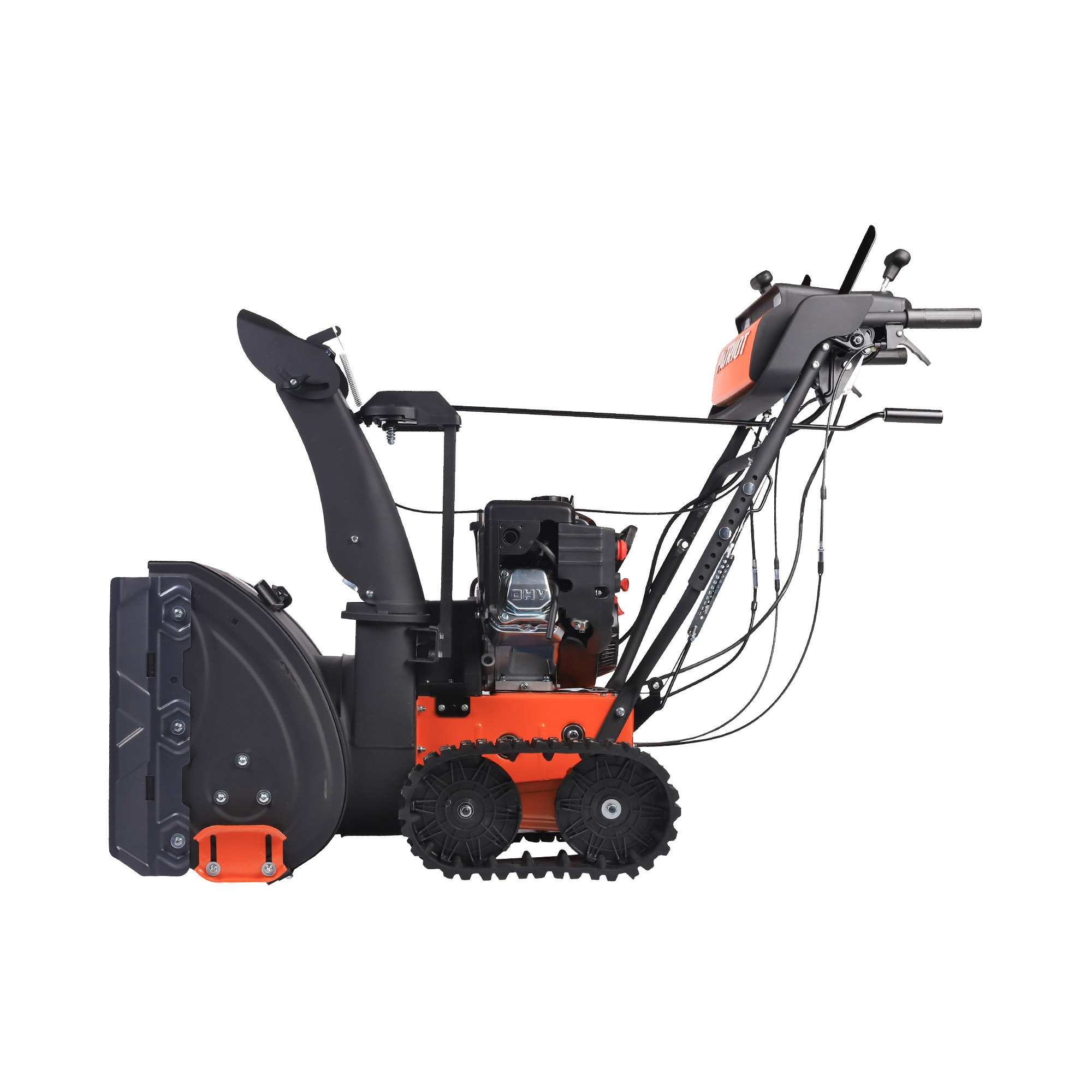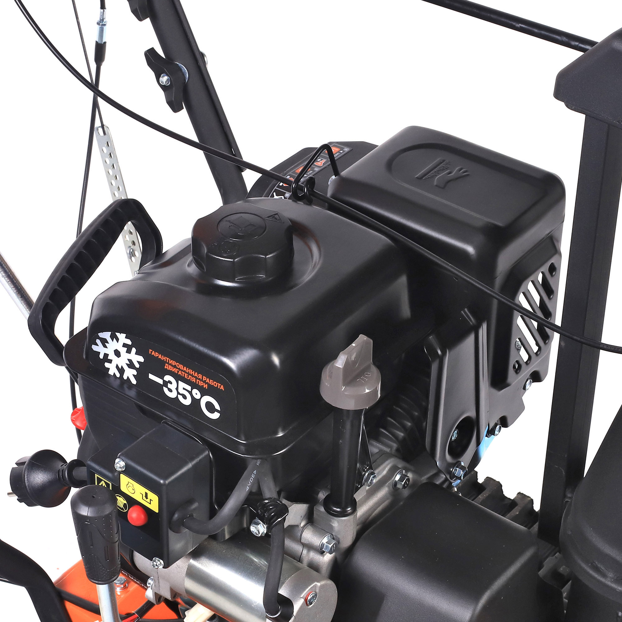 7 л.с, 212 см.куб, бак 2.2 л, 4-х тактный двигатель, картер 0.6 л, металлический шнек, ширина обработки 71 см, высота обработки 53 см, диаметр шнека 300 мм, 10 м дальность, 6 вперед/2 назад, эл.стартер, гусеницы, фара+подогрев