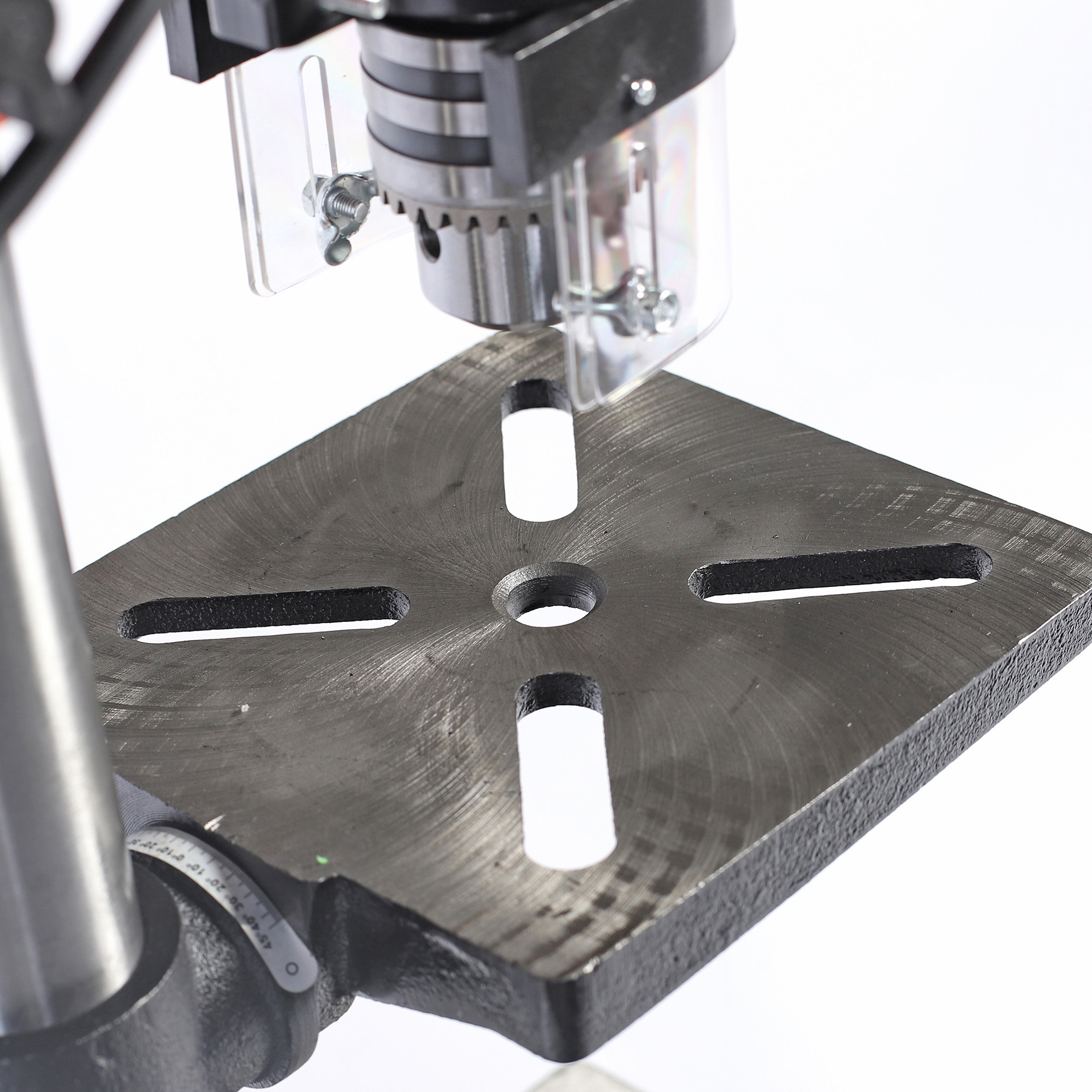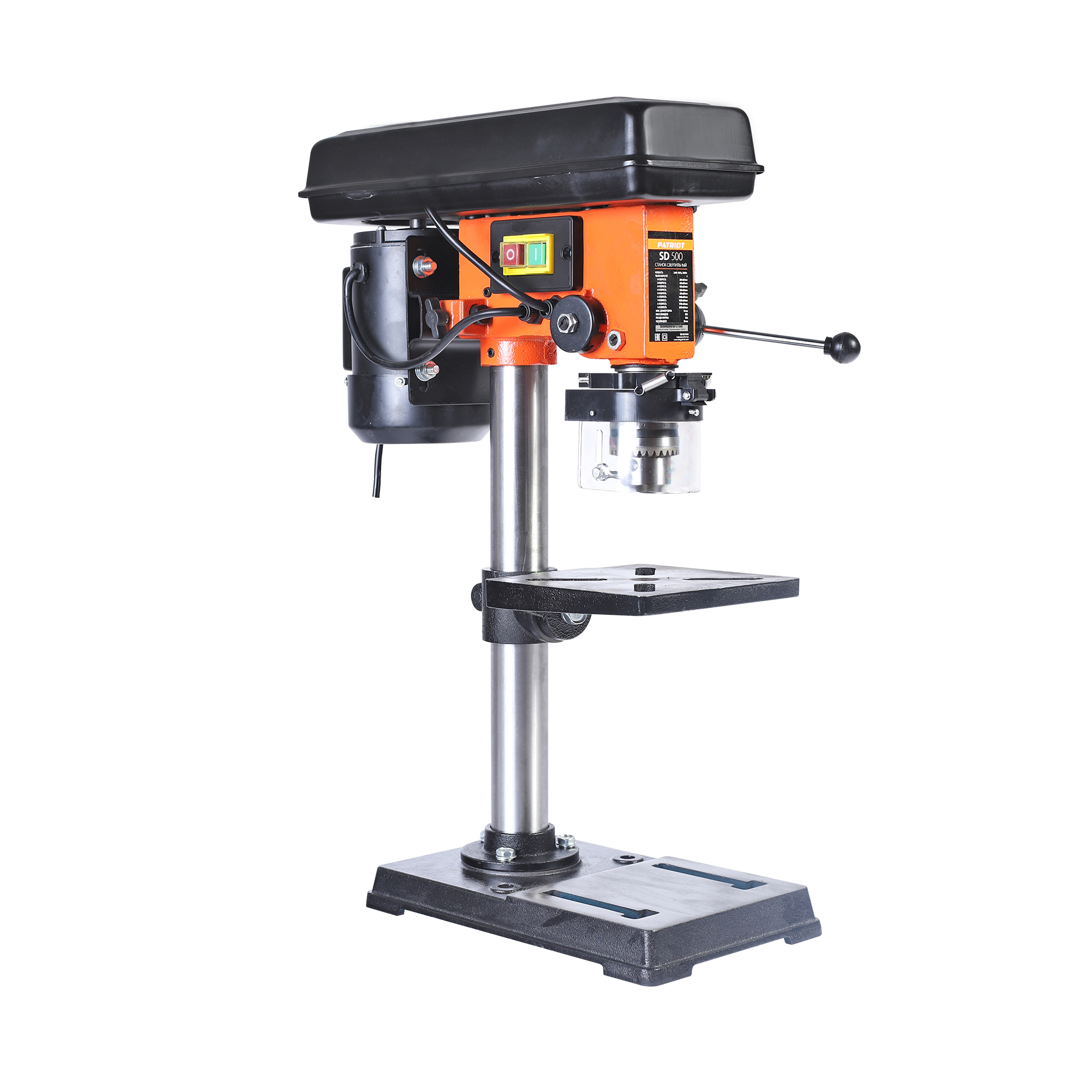 Используются, как в домашних условиях, так и на производстве для получения аккуратных и точных отверстий в заготовках. Рабочий стол изготавливается из высококачественного чугуна, что гарантирует его прочность и устойчивость. Тиски обеспечат надёжную фиксацию обрабатываемой детали. Вертикальное перемещение рабочего стола осуществляется при помощи удобной вращающейся рукоятки и позволяет точно дозировать подачу инструмента. SD 500 Professional имеет 9 коростных режимов, что позволяет подобрать оптимальный вариант, в зависимости от материала детали, не перегружая двигатель