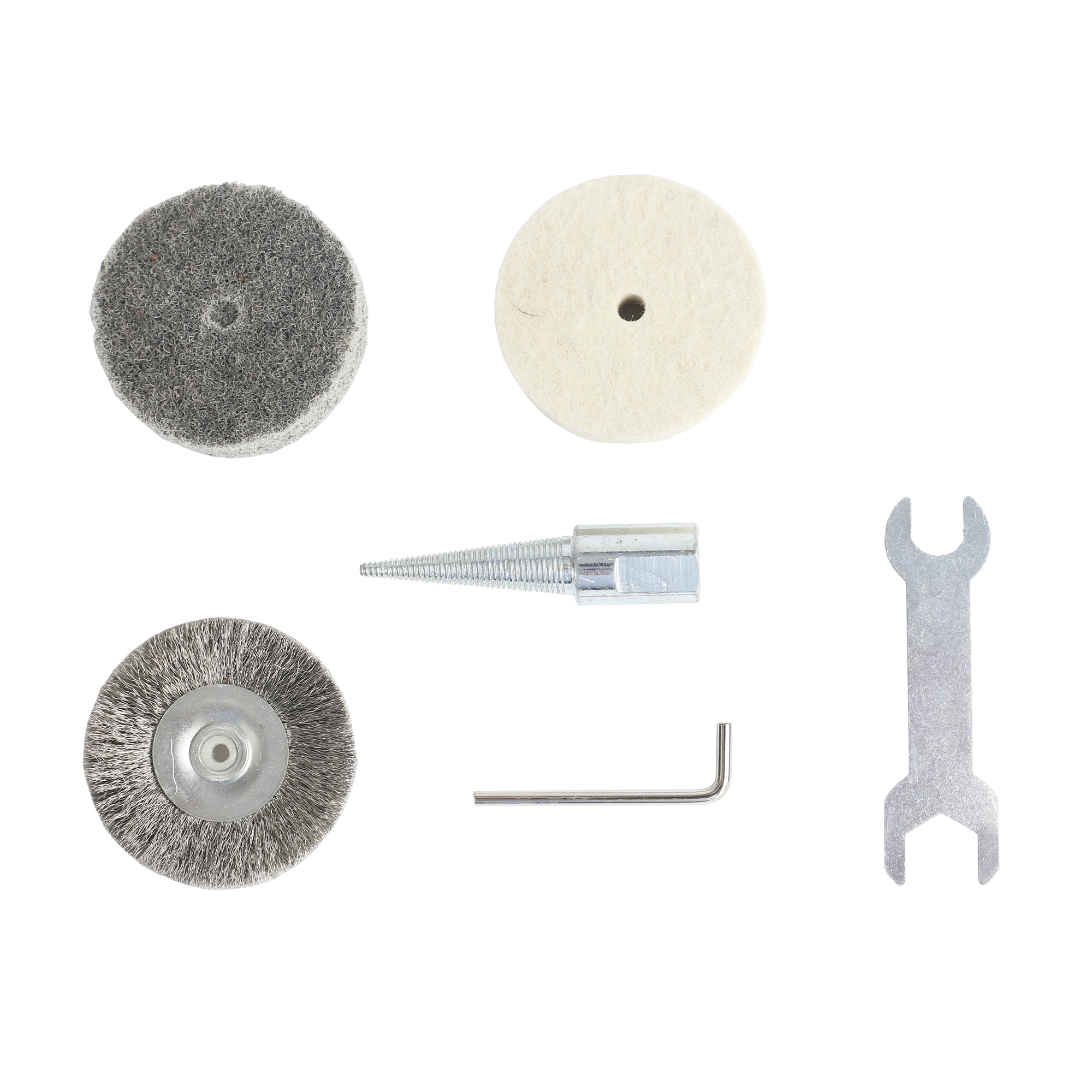 Точильный станок; Гибкий вал; Полировальное колесо шерстяное; Полировальное колеса нейлоновая вата; Металлическая щетка; Сужающуюся шарошка; Инструкция по эксплуатации;