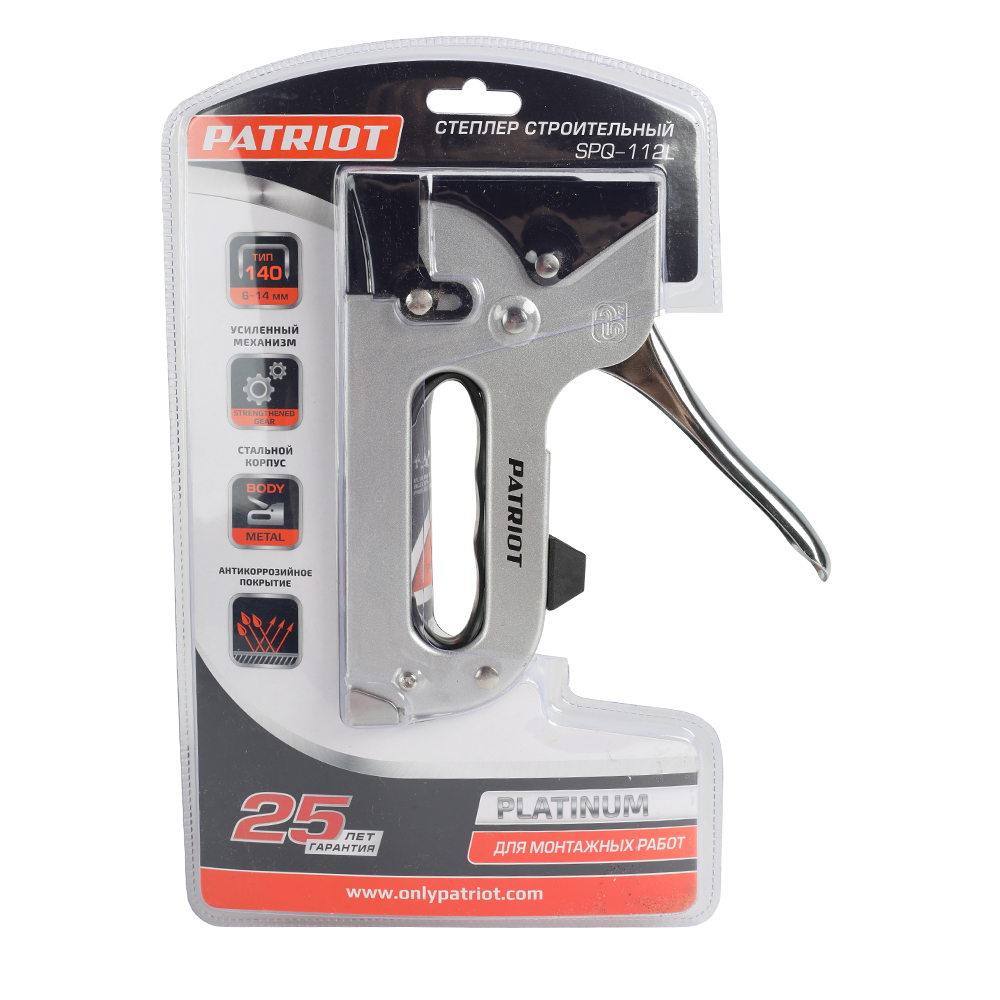 Степлер строительный PATRIOT SPQ-112 L Platinum с усиленным механизмом для крепления тканей и пленок к поверхности из дерева или фанеры. Корпус выполнен из износостойкой стали. Эргономичная рукоятка снижает нагрузку на руку при работе. В комплекте идет набор из 1000 скоб размером 6-14 мм.