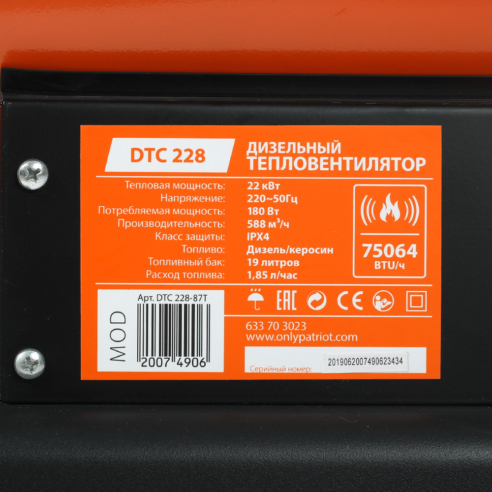 В теплогенераторах Patriot реализованы различные передовые технологии: система максимального сжигания топлива увеличивает КПД и уменьшает выброс в атмосферу отработанных газов, индикация и регулировка температуры на выходе, система защиты от перегрева, электронный контроль пламени с фотоэлементом, автоматическое распознавание неисправностей, термостат с цифровым индикатором (поддерживает заданную температуру).