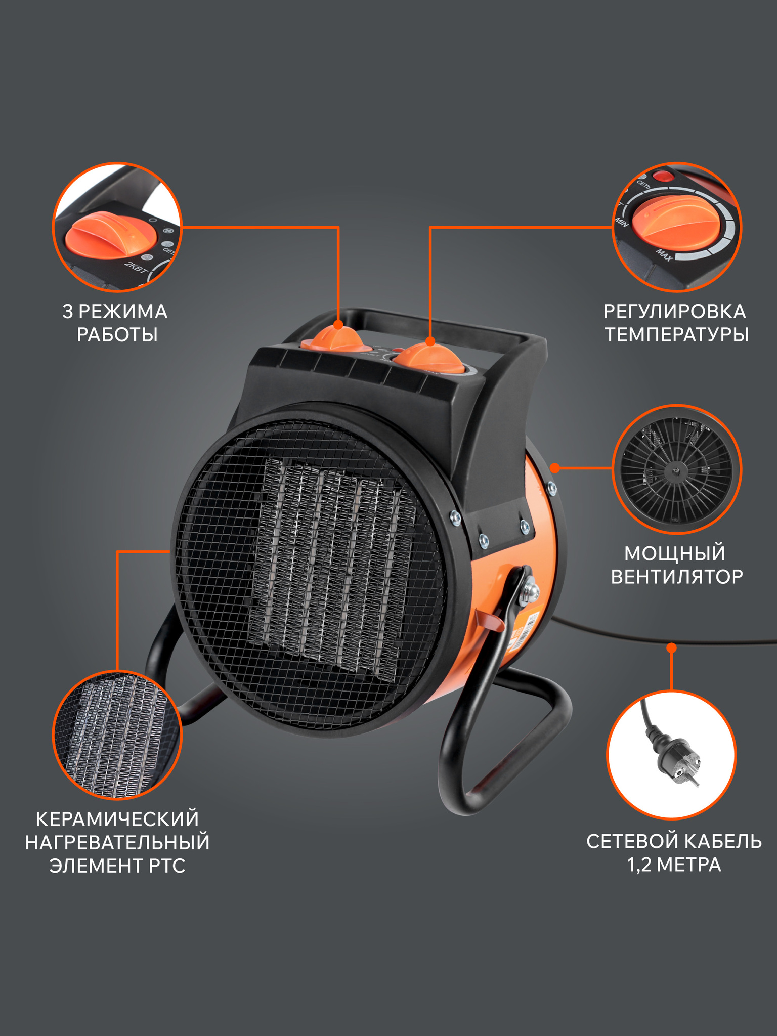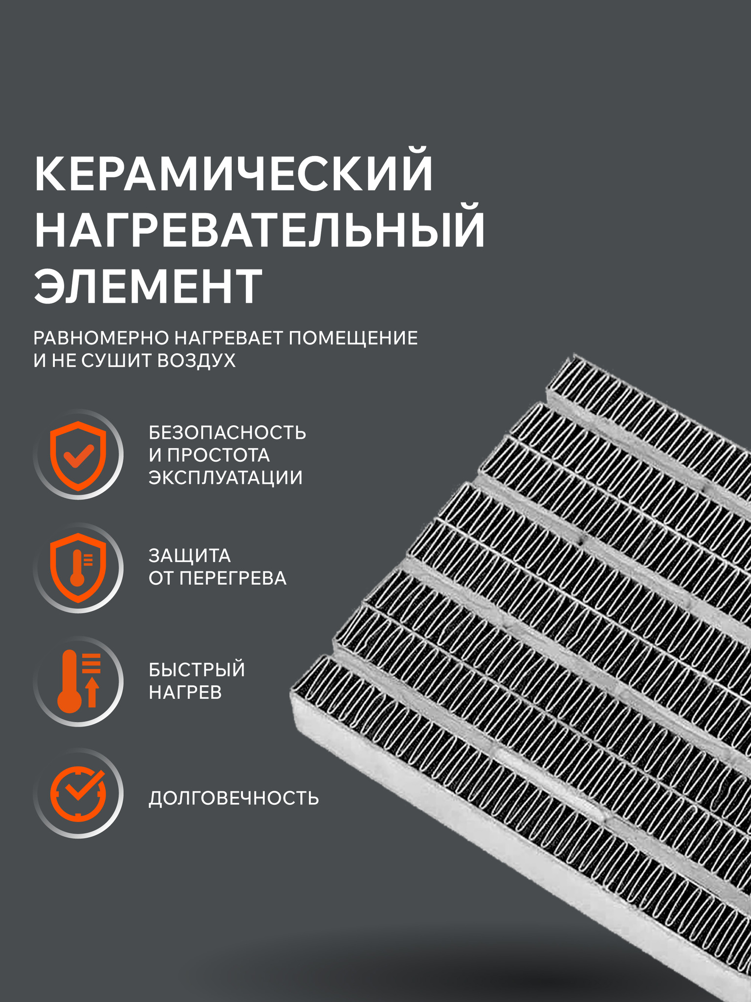 Компактный, мобильный, надежный нагревательный электроприбор. Служит для обогрева воздуха в различных помещениях. В жаркое время года возможно использование прибора в качестве вентилятора, без включения нагревательных элементов. В обогревателе используется высококачественный керамический полупроводниковый нагревательный элемент PTC, при работе которого уровень мощности автоматически корректируется в зависимости от изменений температуры окружающей среды. За счет уникальных свойств нагревательного элемента, увеличивается срок службы прибора. В обогревателе установлено мощное воздуходувное устройство, благодаря которому приятный горячий воздух подается с большой скоростью, что позволяет быстро и эффективно прогреть помещение.