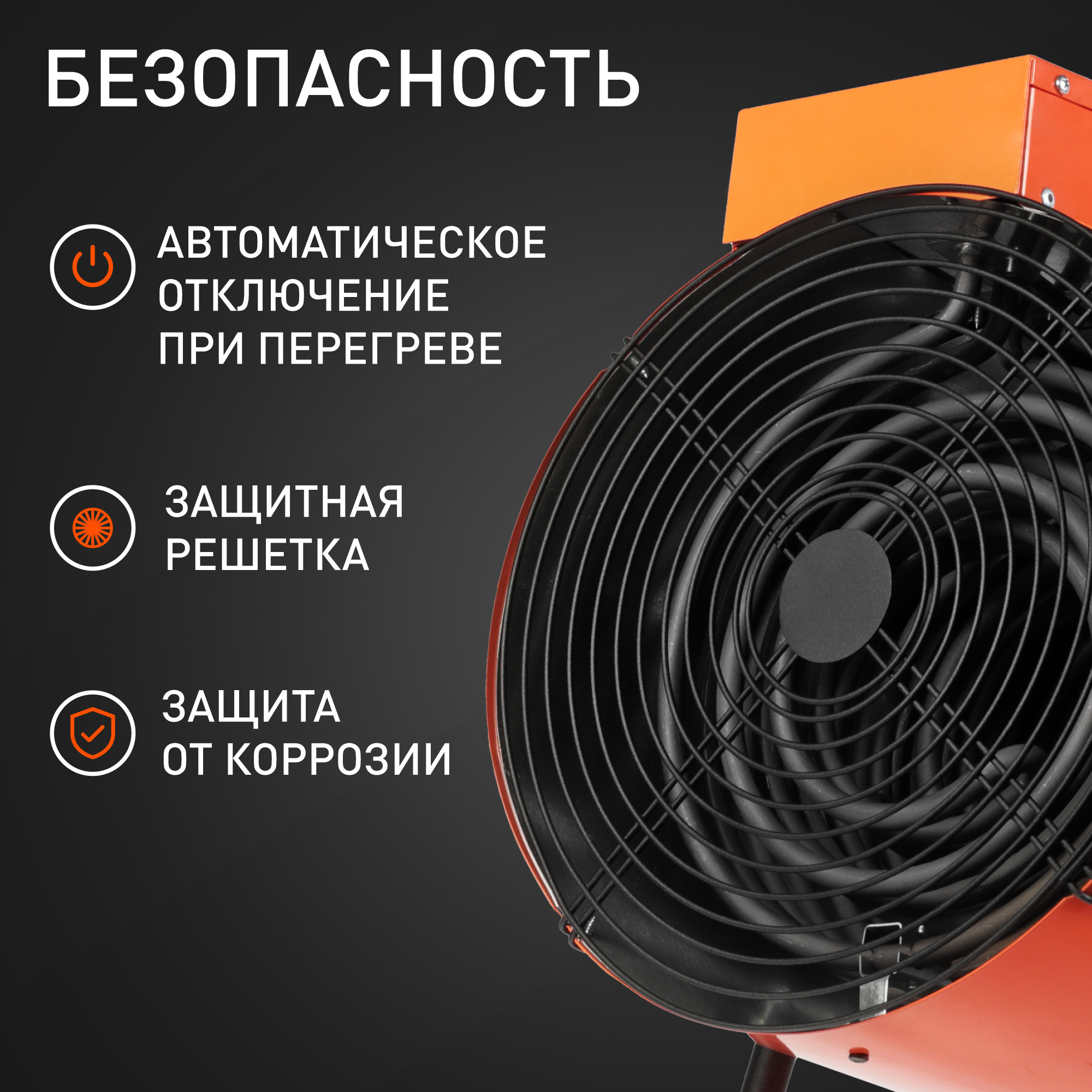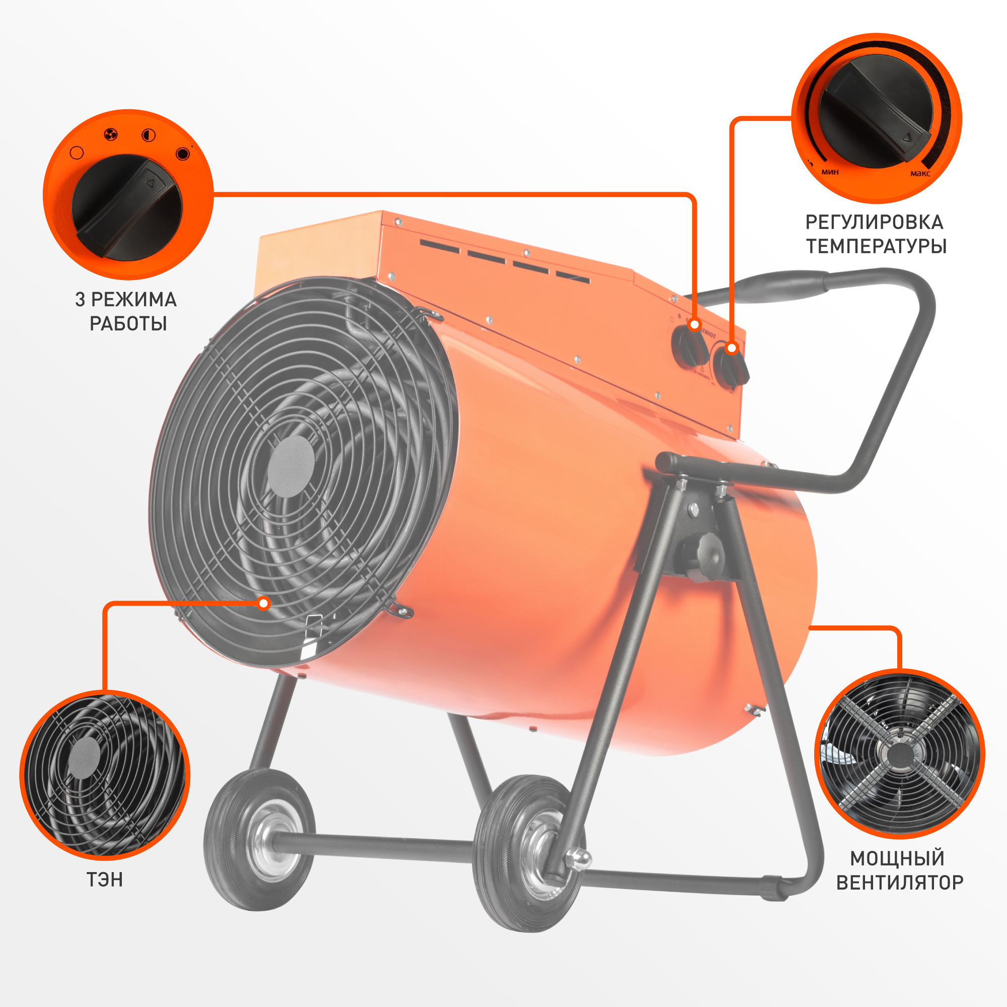 Тепловая пушка электрическая предназначена для обогрева воздуха в различных помещениях, таких как: промышленные ангары, склады, гаражи, торговые павильоны, строительные объекты и т.д. Корпус обогревателя выполнен в двойном исполнении, что не позволяет ему нагреваться во время эксплуатации. В жаркое время года возможно использование прибора в качестве вентилятора, без включения нагревательных элементов.