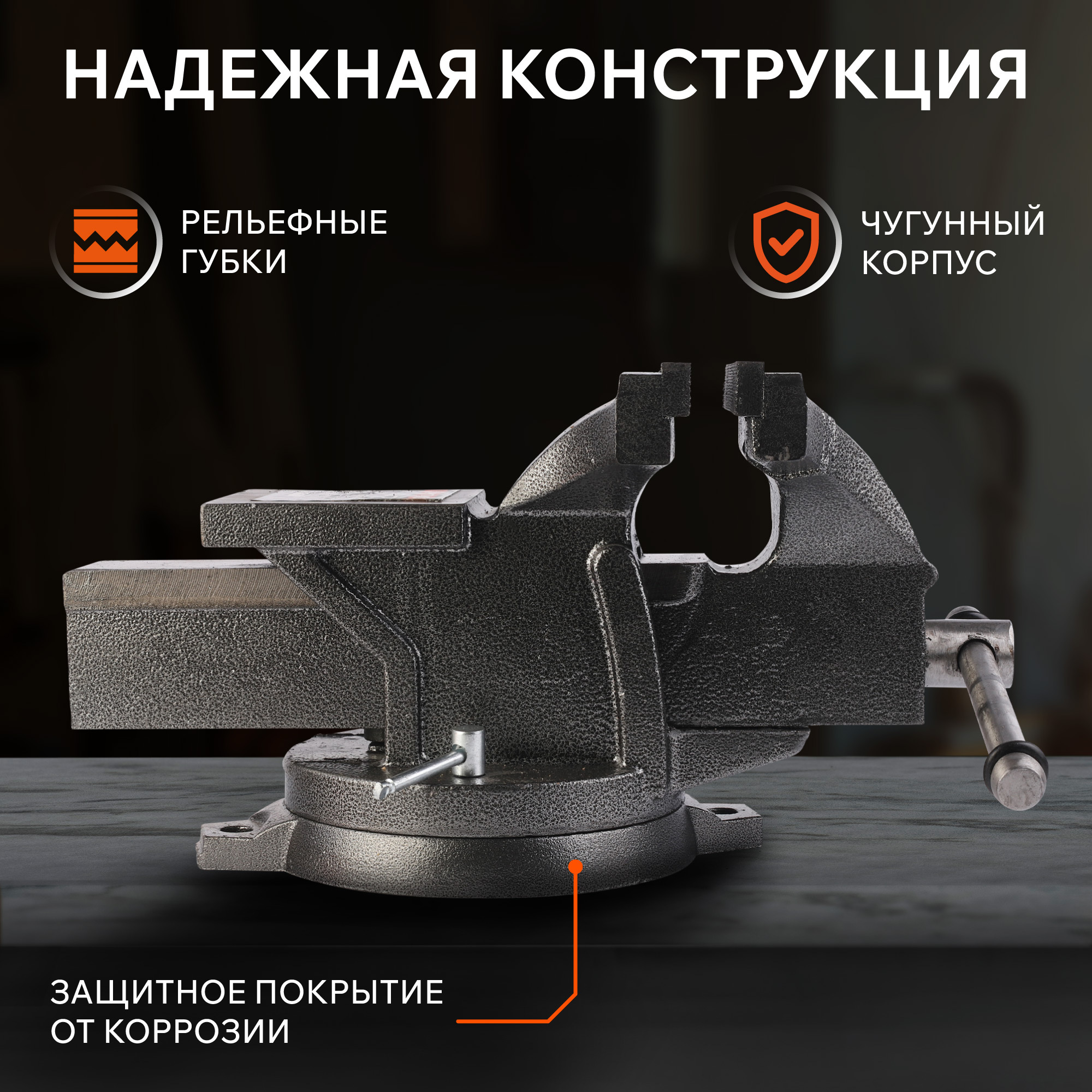 150 мм ход губок, 200 мм ширина губок, 2500 кгс усилие, поворот на 360 градусов, корпус из чугуна, губки из стали