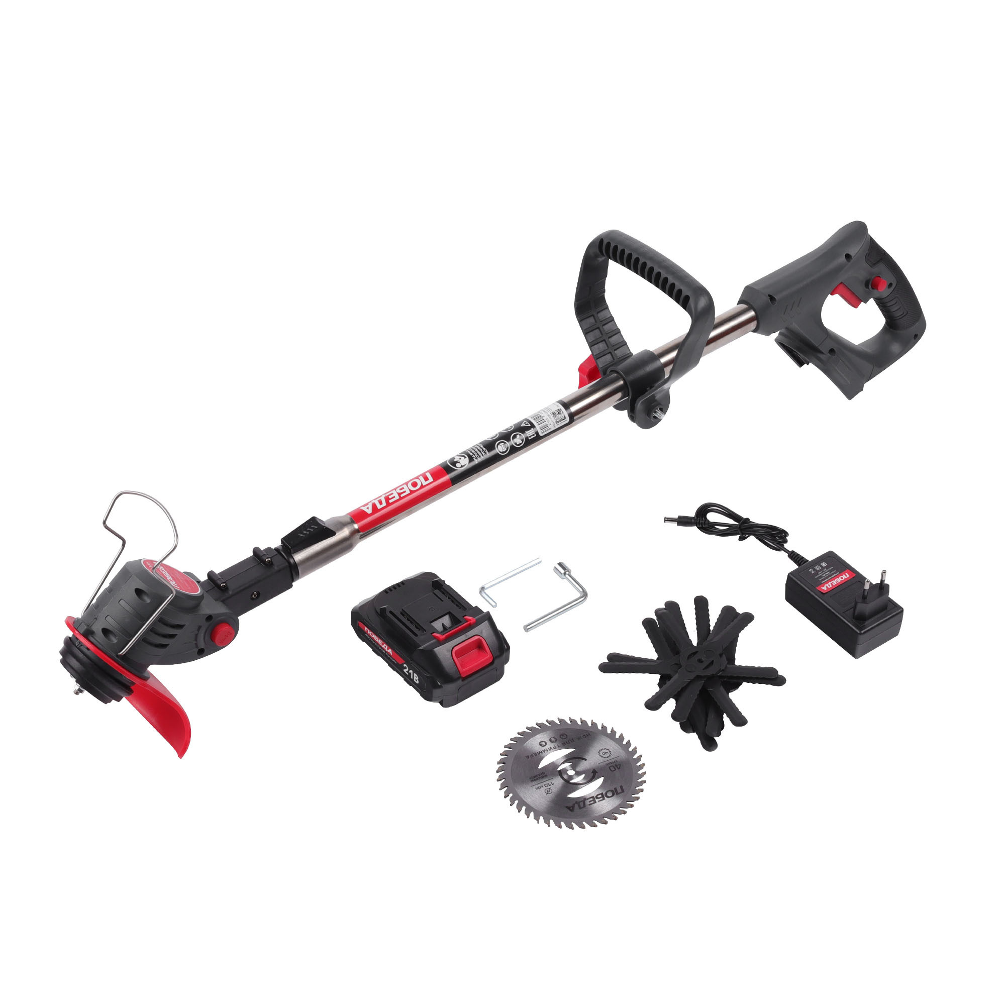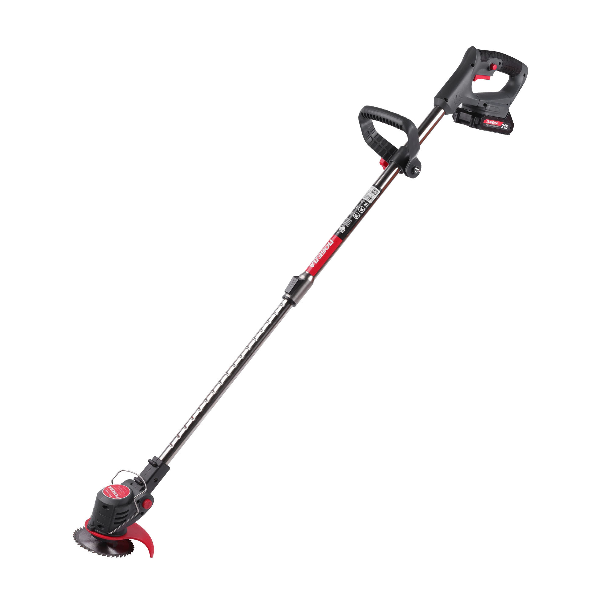 Аккумуляторный триммер 21В с регулируемой передней рукояткой, телескопической штангой, с изменяемым углом наклона головки, с пластиковыми ножами и металлическим диском. Ширина кошения - 145мм. АКБ и ЗУ в комплекте.