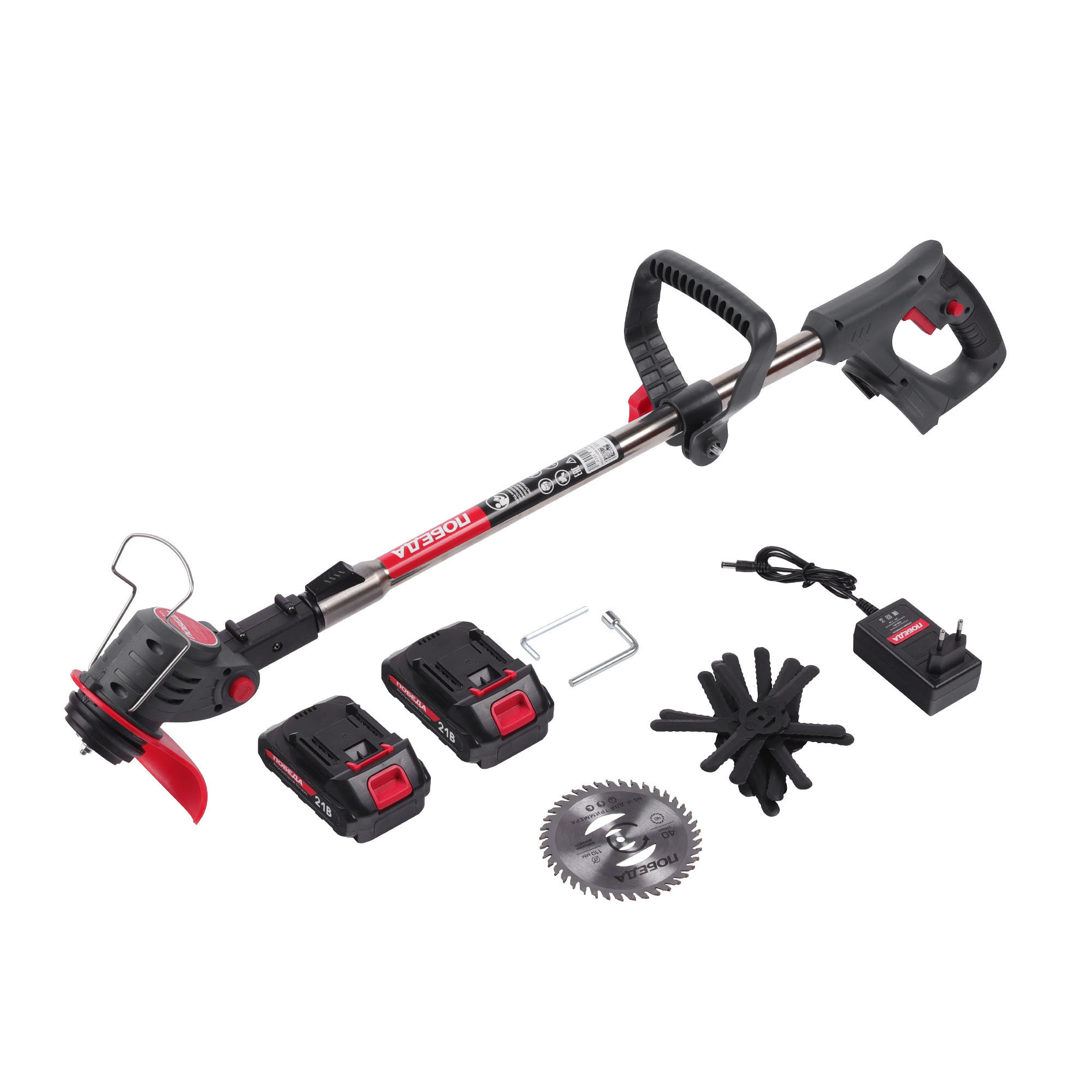 Триммер; Рукоятка; Защитный кожух; Набор для сборки; Фиксатор рукоятки; Нож триммерный (пластик) 10шт.; Металлический диск (сталь) 1шт.; АКБ 2шт.; ЗУ; Инструкция
