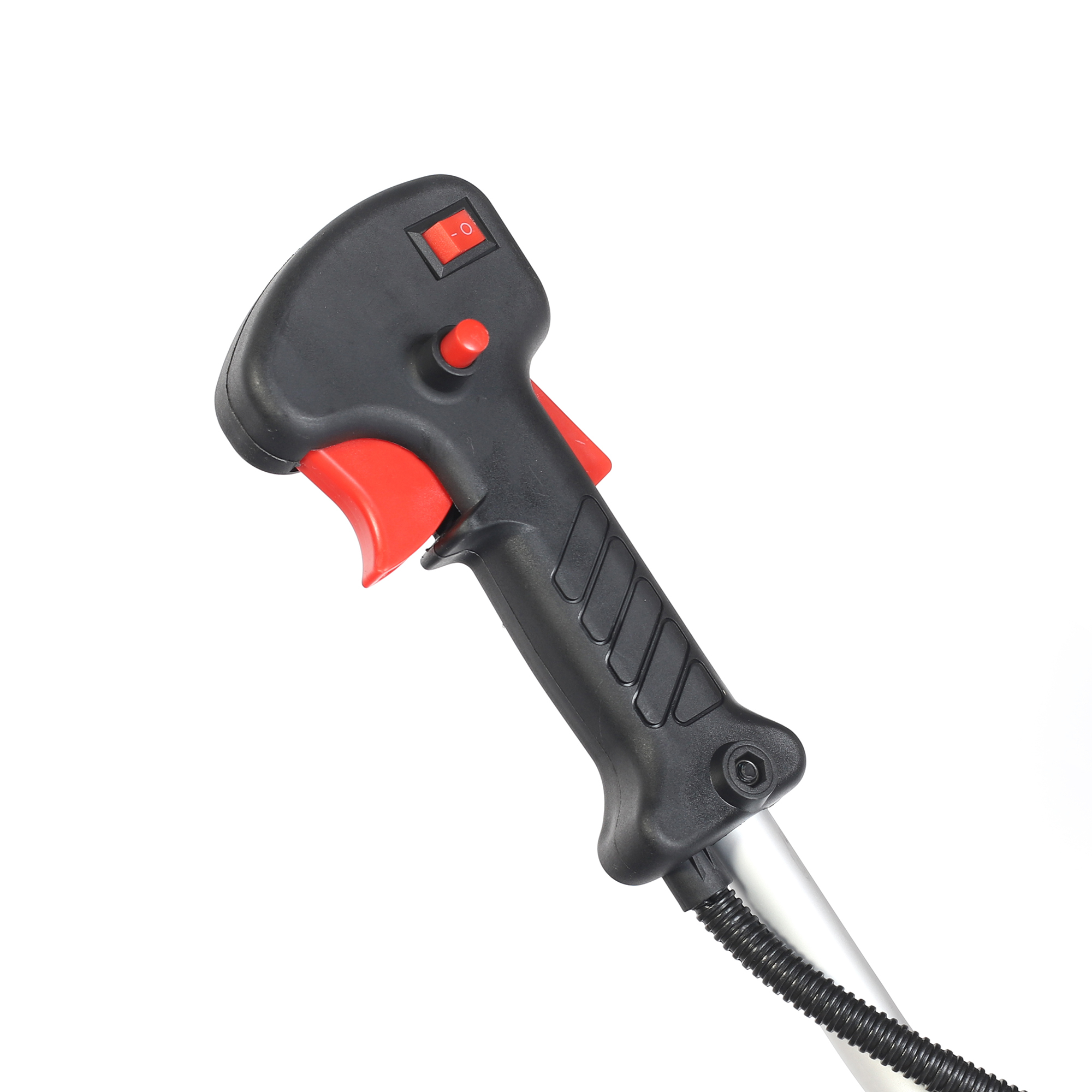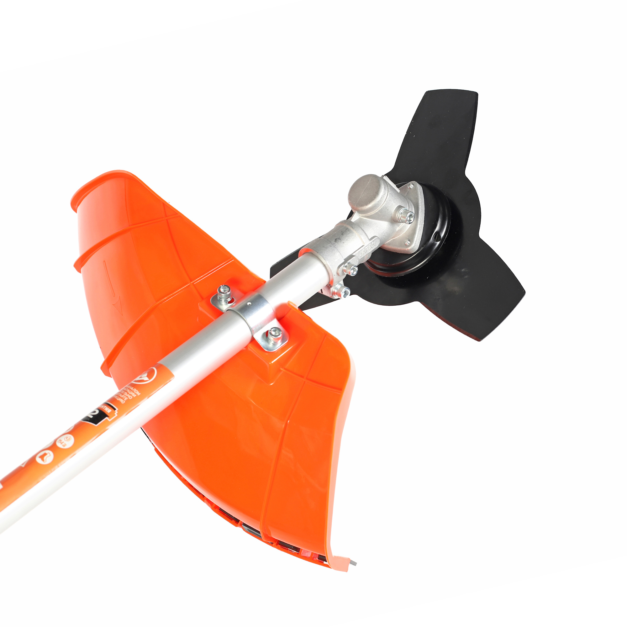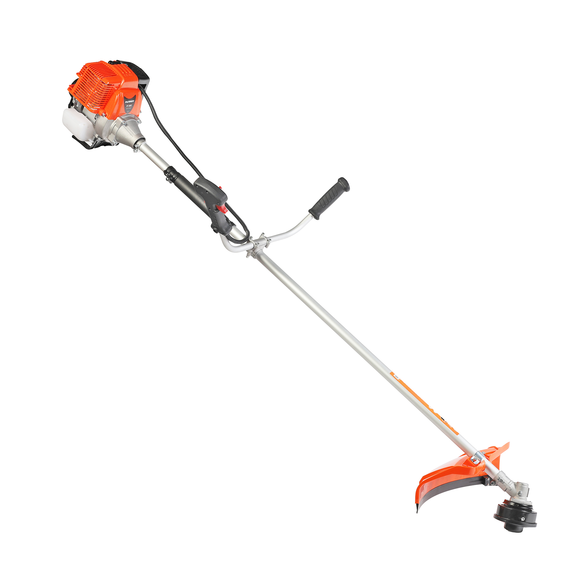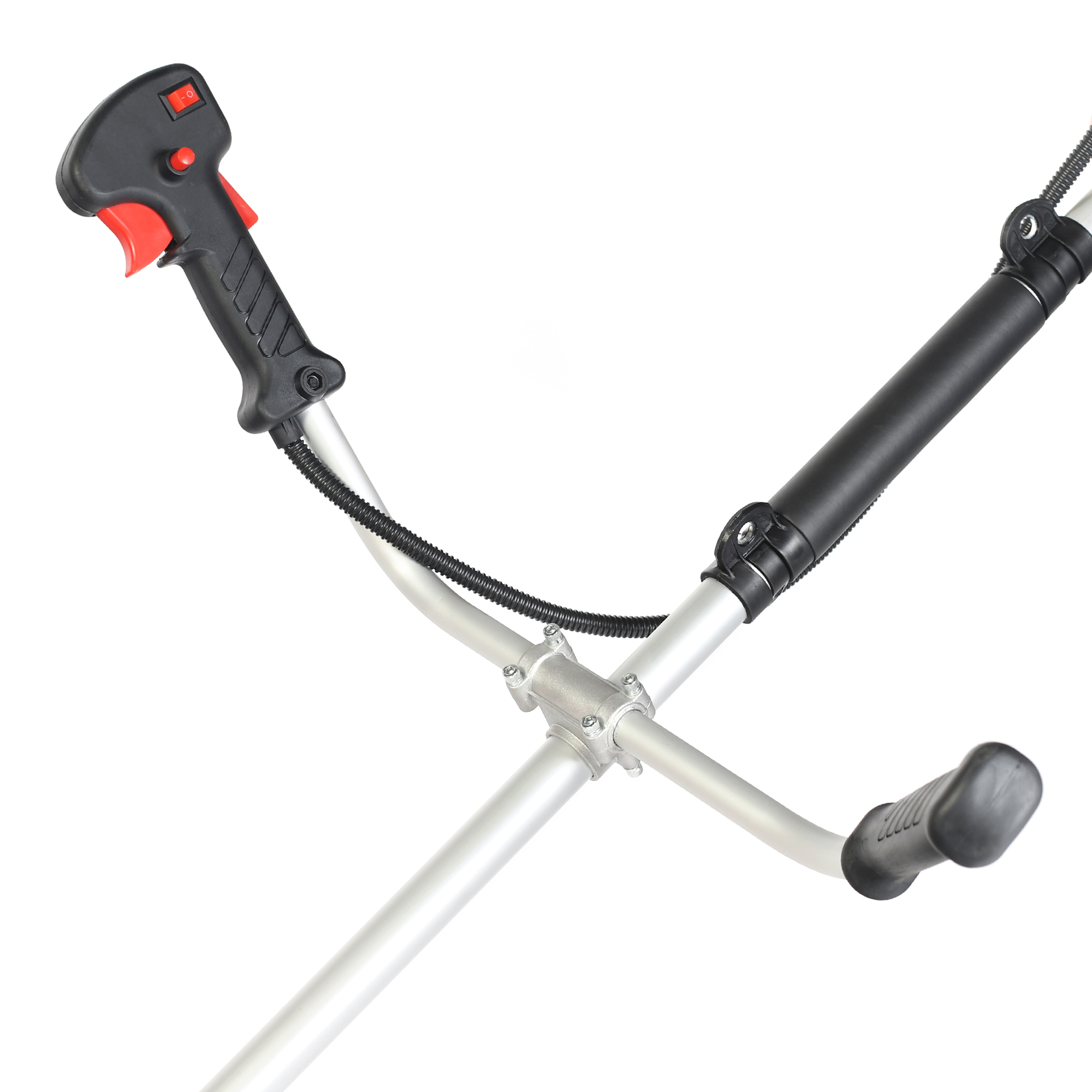1.3 л.с, 31 см.куб, бак 0.8 л, ширина скашивания 430 мм, диаметр ножа 255 мм, диаметр лески 2.4-3 мм, посадочный диаметр М10х1.25LH, диаметр штанги 28 мм, 2-х тактный двигатель, легкий старт, неразборная штанга, U-образная рукоятка, жесткий вал, антивибрационная система