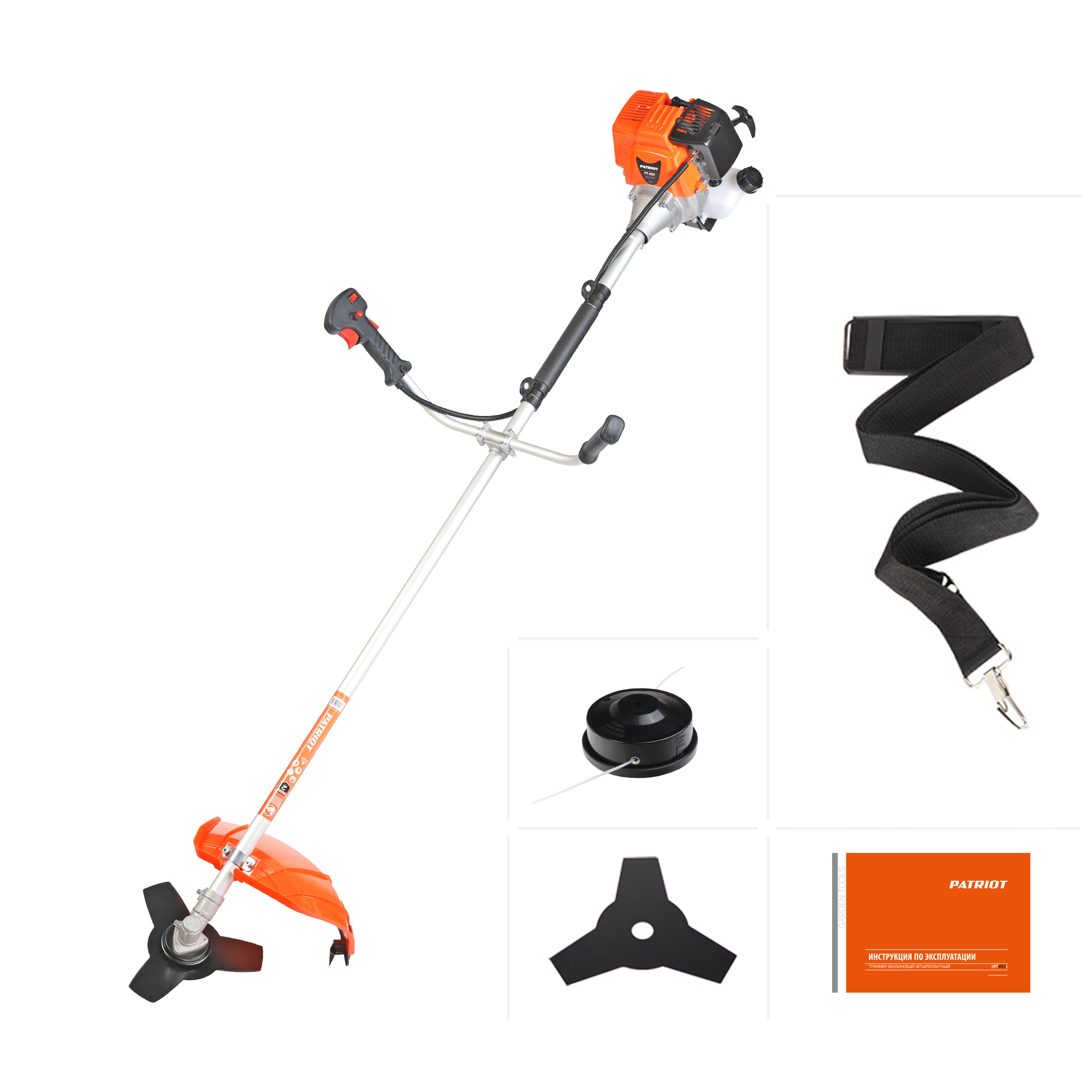Двигатель в сборе с рукояткой; Трансмиссионный узел в сборе; Рукоятка; Защитный кожух с крепежной планкой; Набор ключей для сборки и обслуживания (опционально); Набор креплений для сборки; Комплект для установки триммерного ножа; Триммерная катушка; Нож 3-х лопастной; Разгрузочный ремень; Инструкция по эксплуатации;